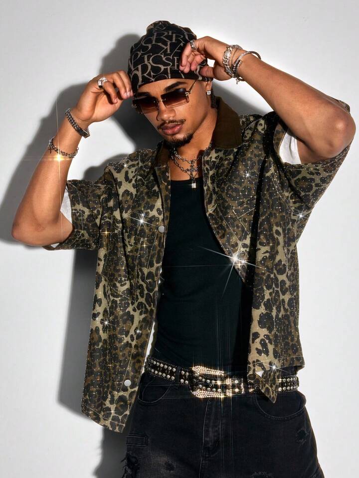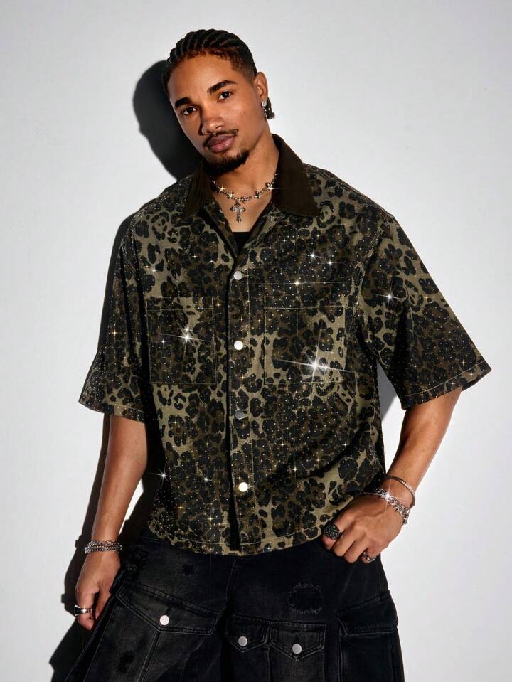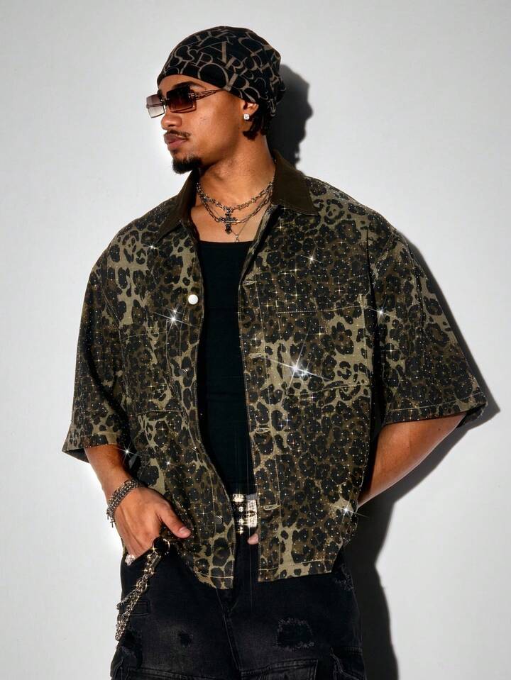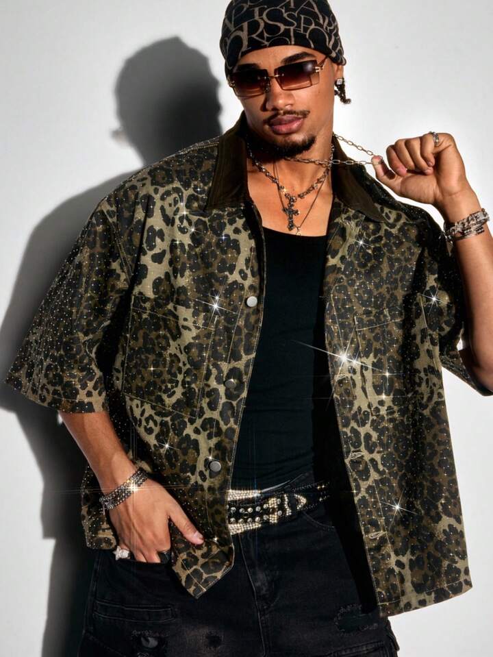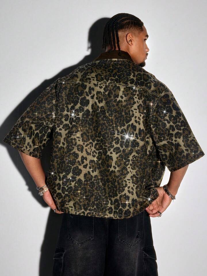 Grunge Punk Top casual in denim con stampa leopardata e diamanti