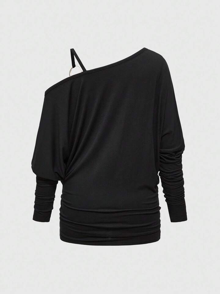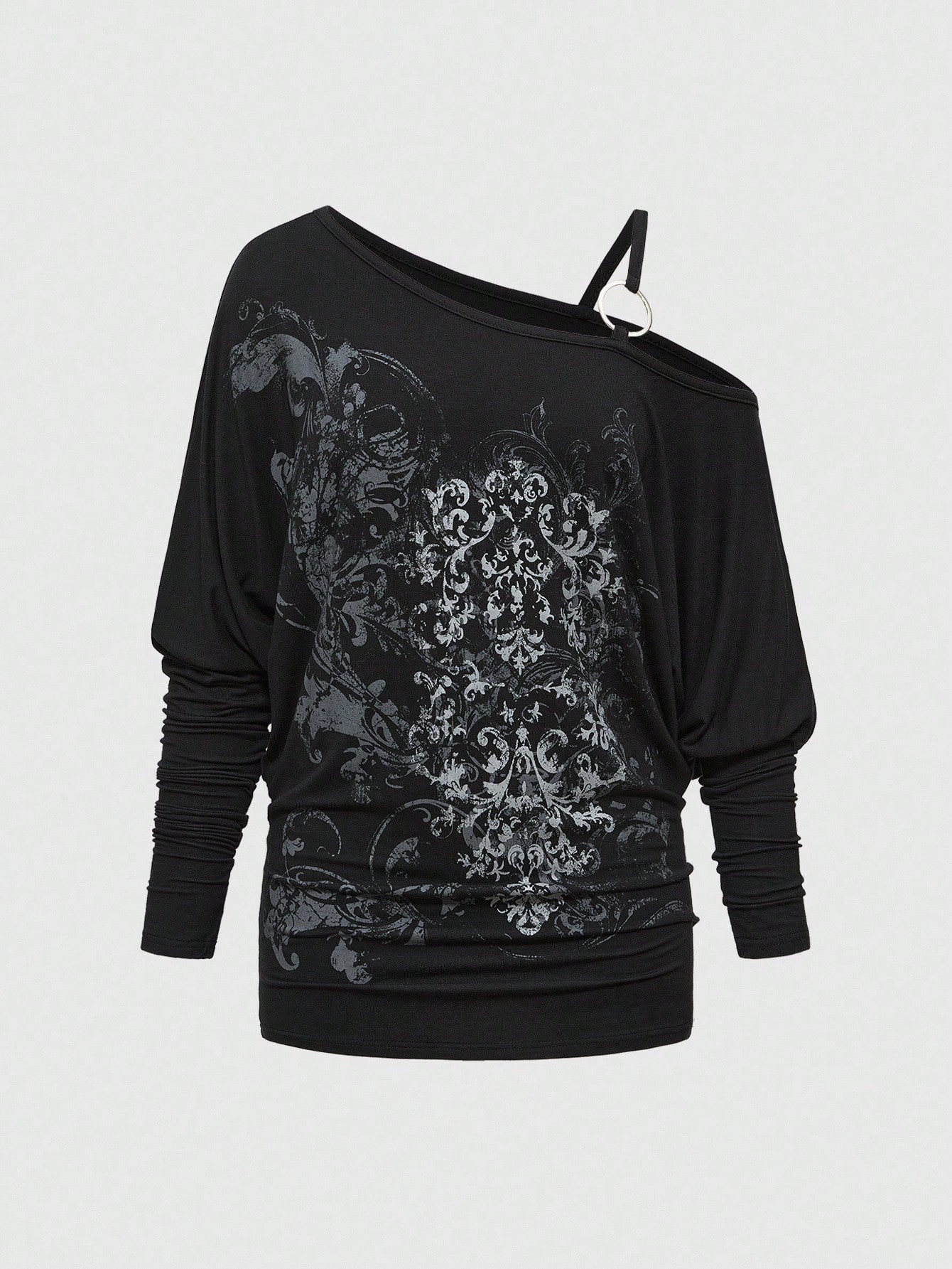 Grunge Punk Elegante e carino top da donna a maniche a pipistrello con stampa di vite tropicale viola, spalle incrociate, elastico e arricciato