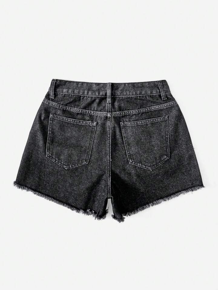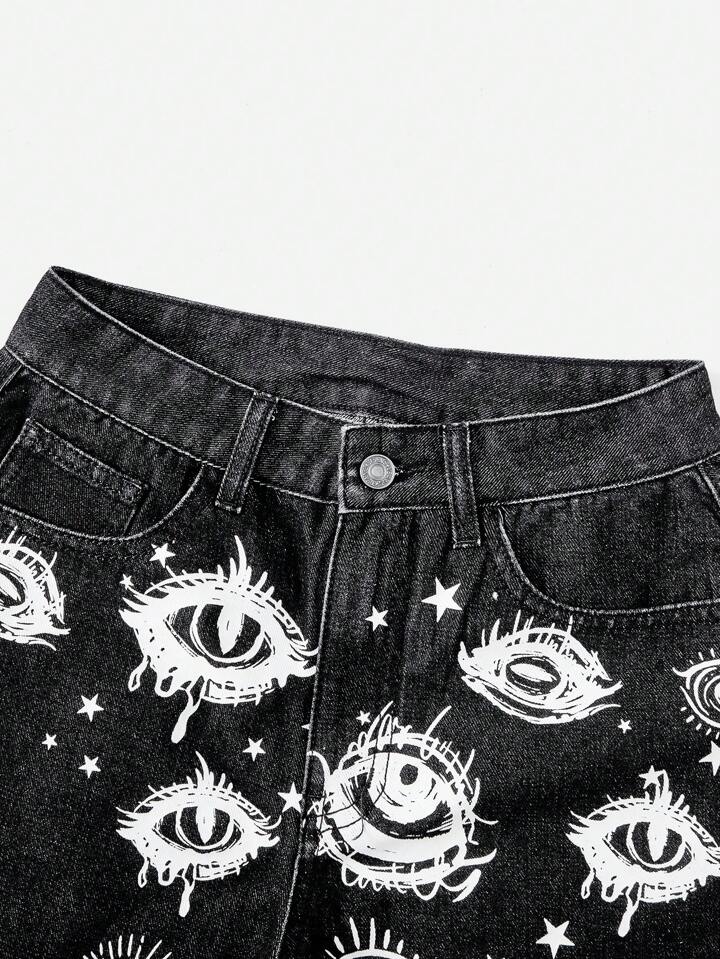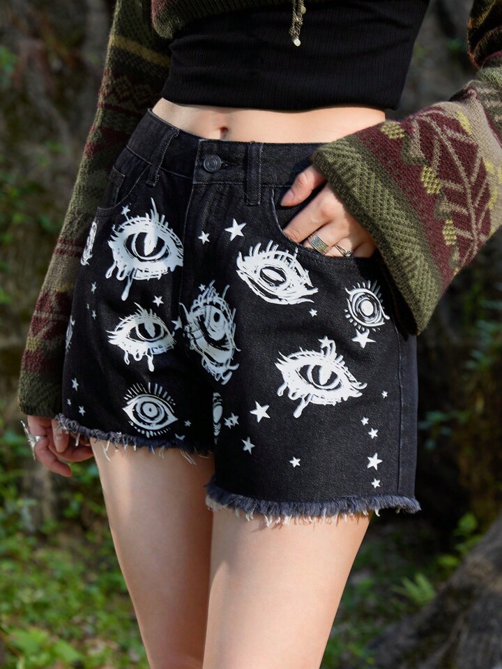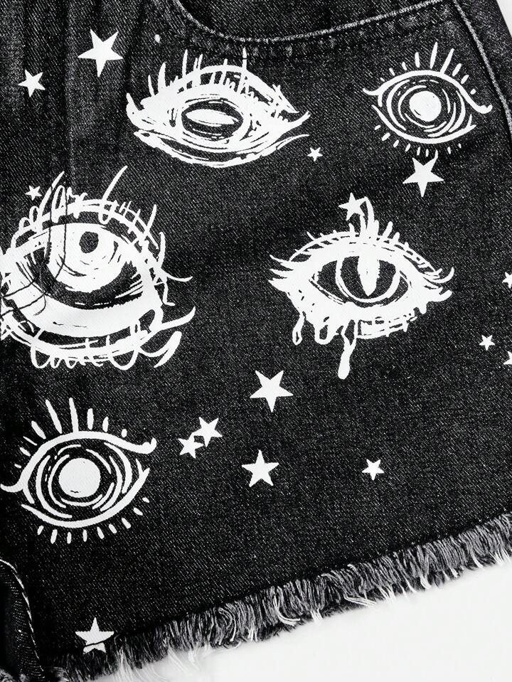 Grunge Punk Shorts in denim stampa occhi bordo grezzo
