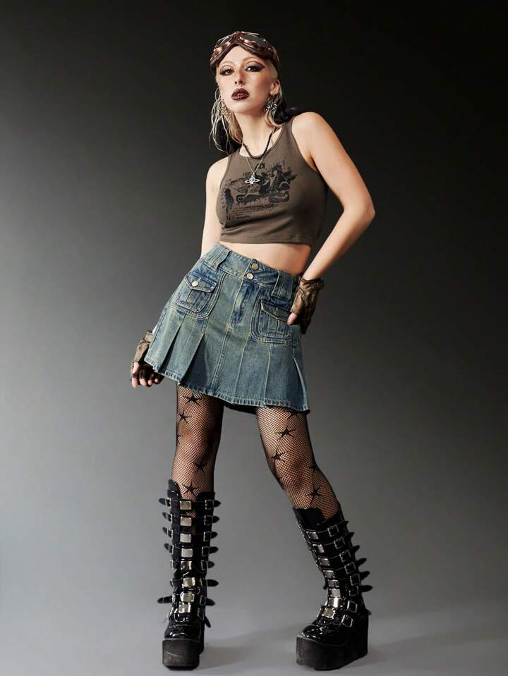 Grunge Punk Gonna in denim tasca con patta plissettato