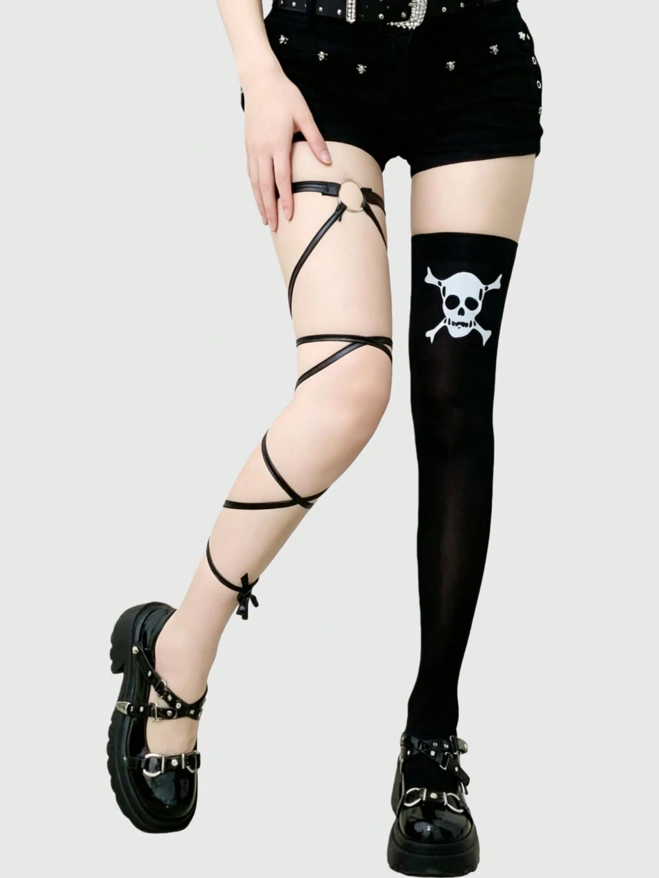 Grunge Punk Calze al ginocchio stile gotico a righe bianche e nere con stampa teschio, moda punk Y2K da strada, adatte per feste, raduni, eventi sociali, Ognissanti