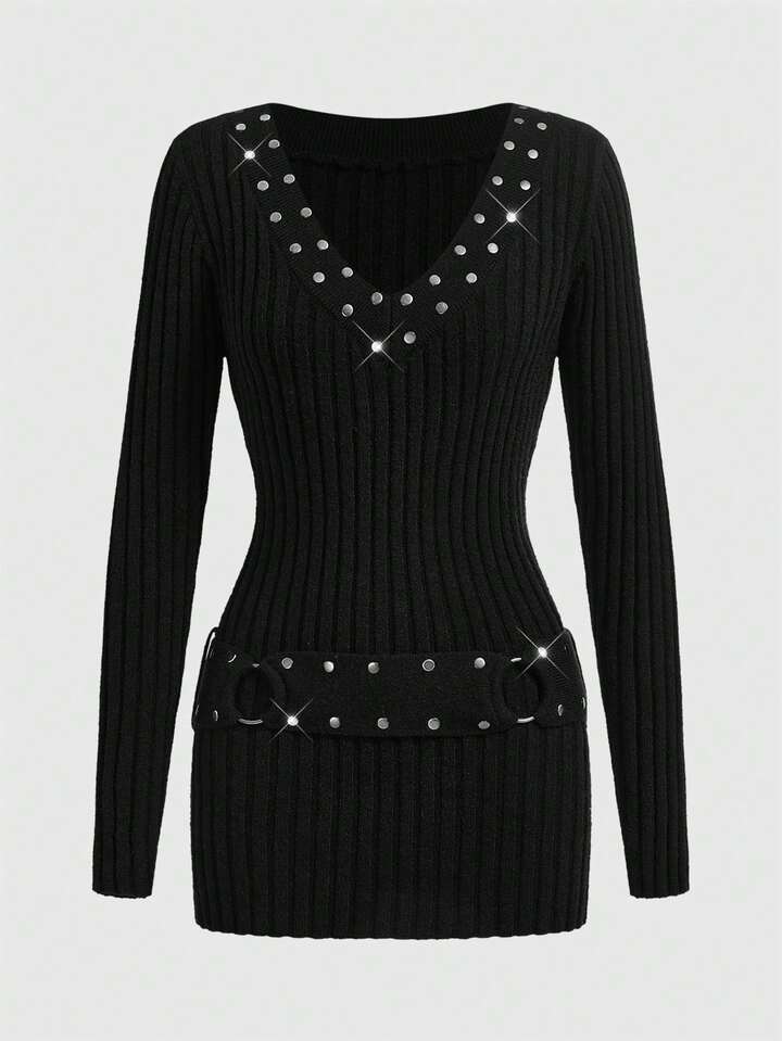 Grunge Punk Maglione da donna con scollo a V profondo, cintura in vita con borchie in bronzo, stile grunge rock