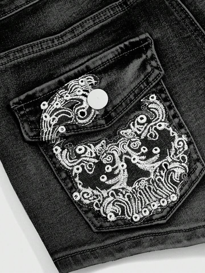 Grunge Punk Pantaloncini di jeans attillati, in stile punk gyaru, con ricamo, vita bassa, ultra corti e sexy, con tasche sul retro, adatti per la scuola