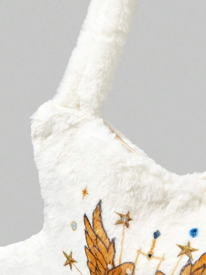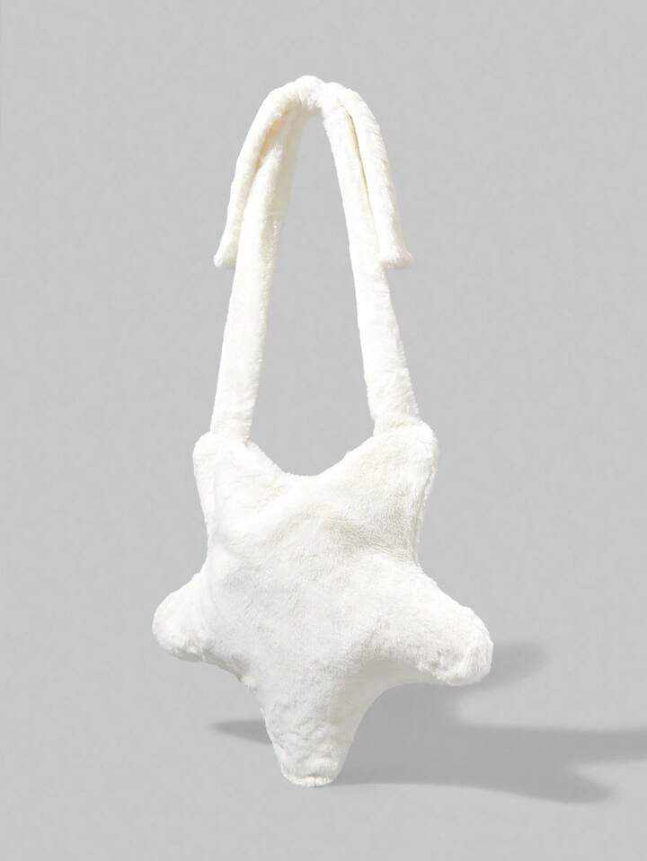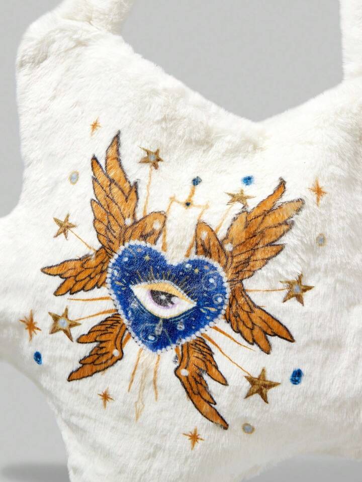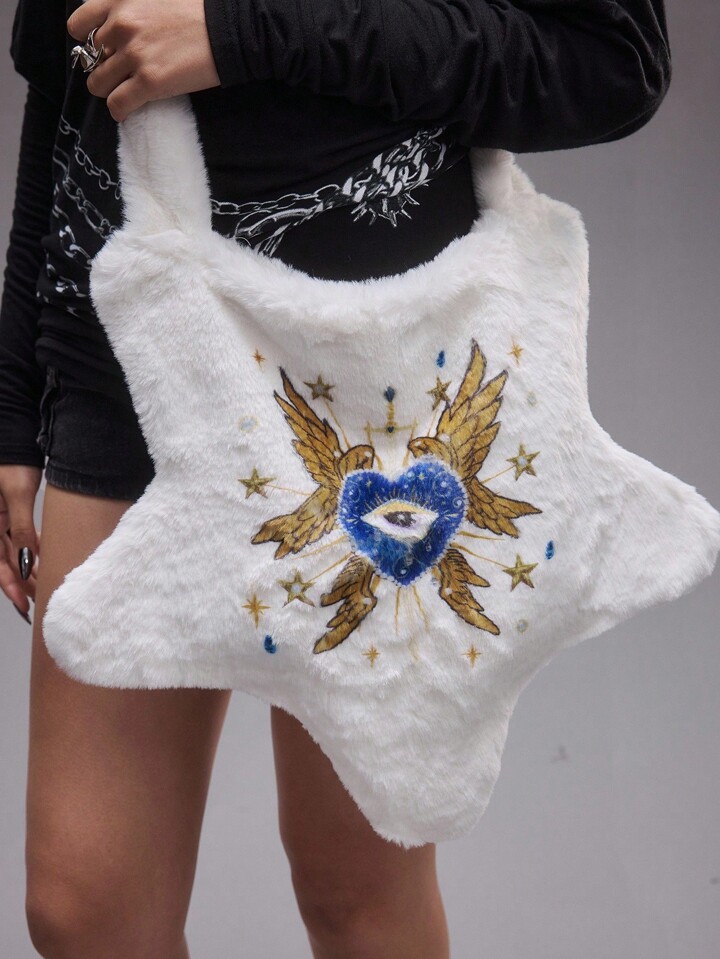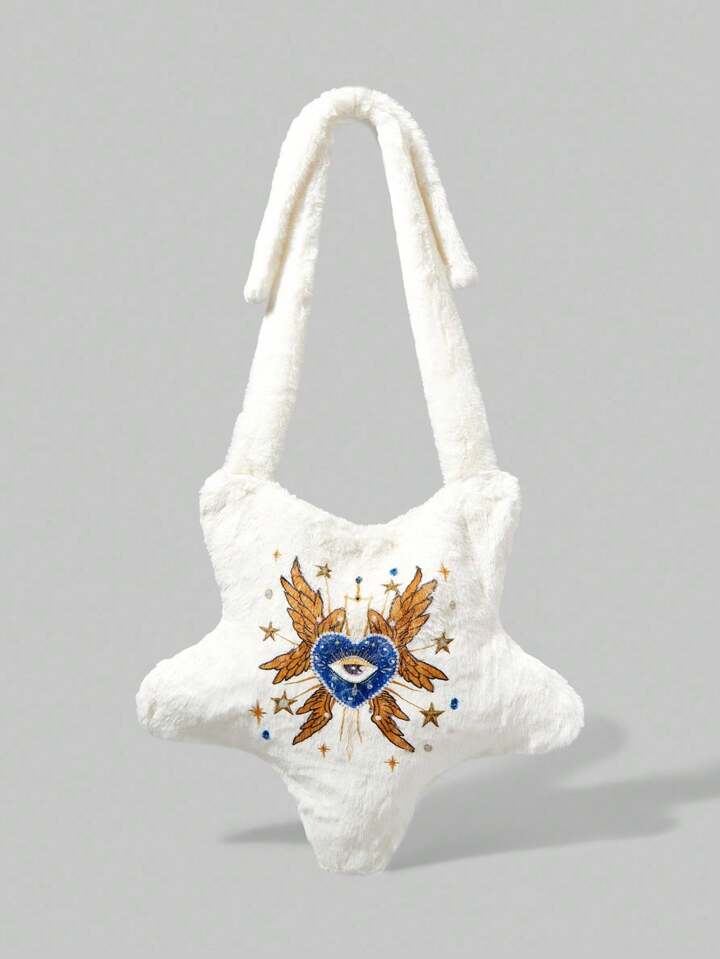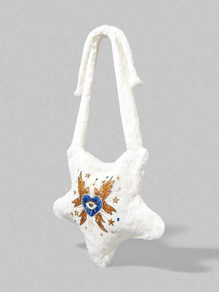 Grunge Punk Borsa a tracolla bianca casual in peluche a forma di stella con design creativo personalizzato con strass a forma di cuore, occhio blu e ali, stile Y2K, adatta per l'autunno/inverno