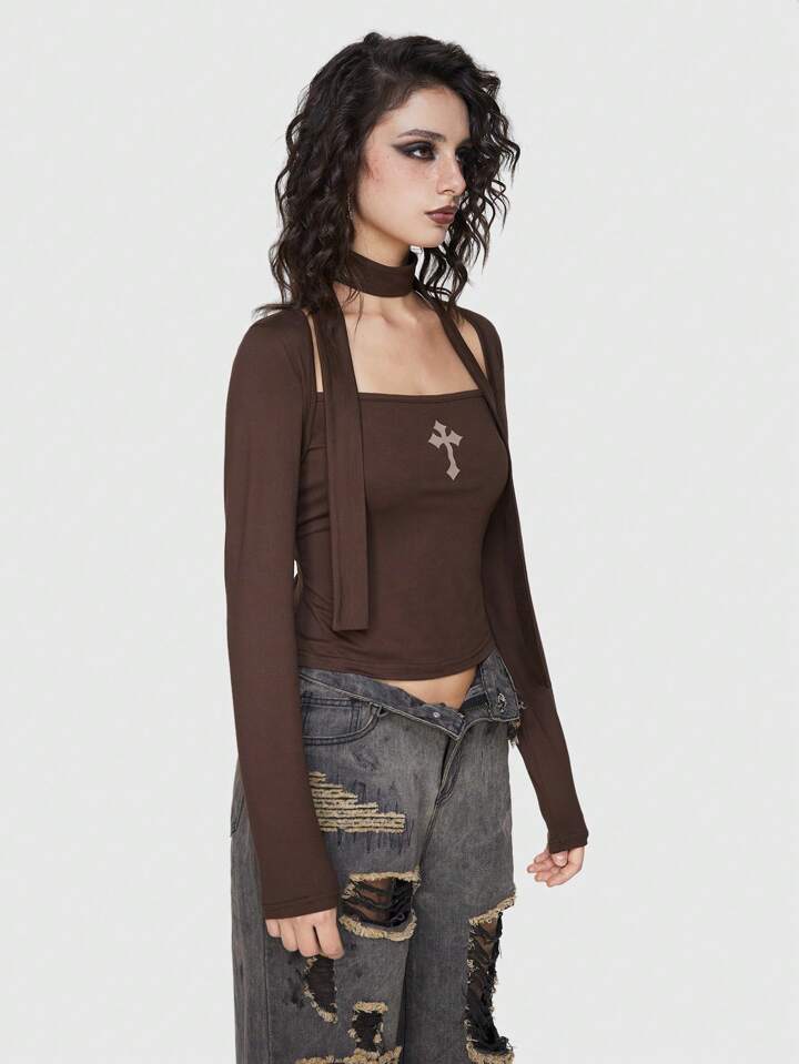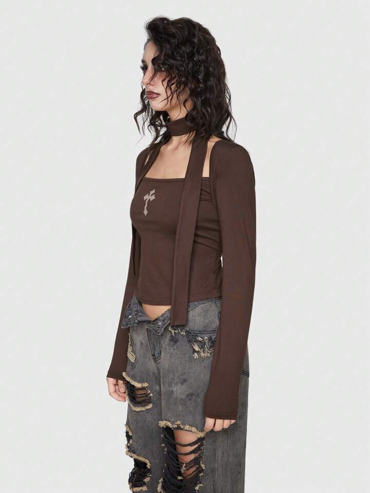 Grunge Punk Maglietta A Maniche Lunghe Con Sciarpa Decorativa A Design Di Mantello Khaki Per Donne
