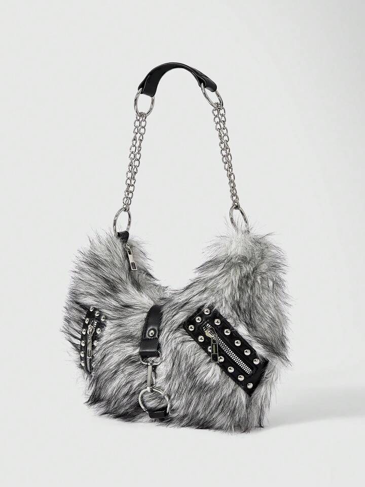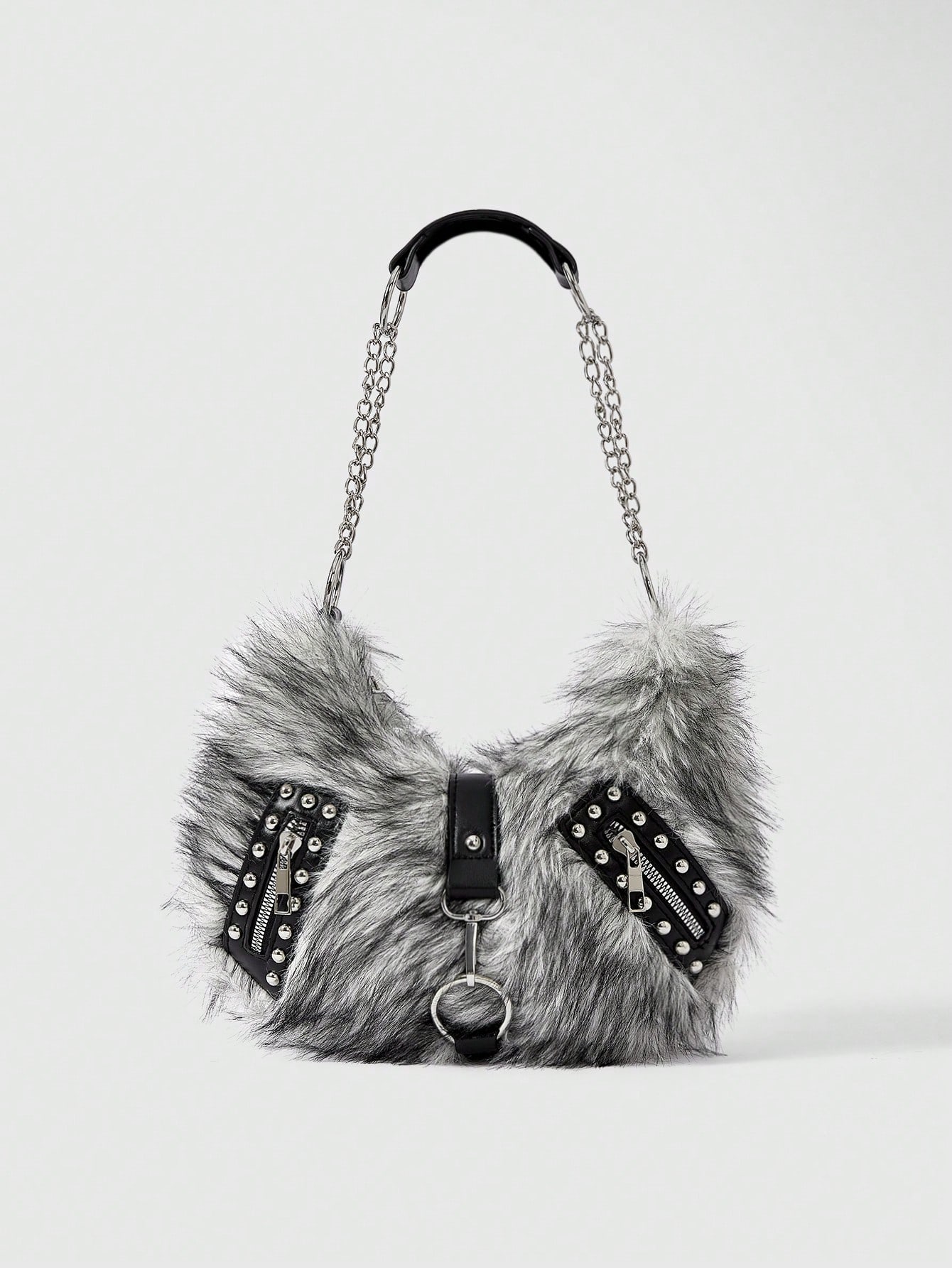 Grunge Punk Borsa a spalla da donna, borsa hobo, in pelliccia sintetica, morbida e soffice, con borchie, alla moda, personalizzabile, versatile, da strada, dolce e cool, per ragazze, punk, stile Y2K, per uso quotidiano, adatta per autunno e inverno (motivo casuale)