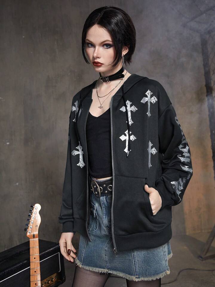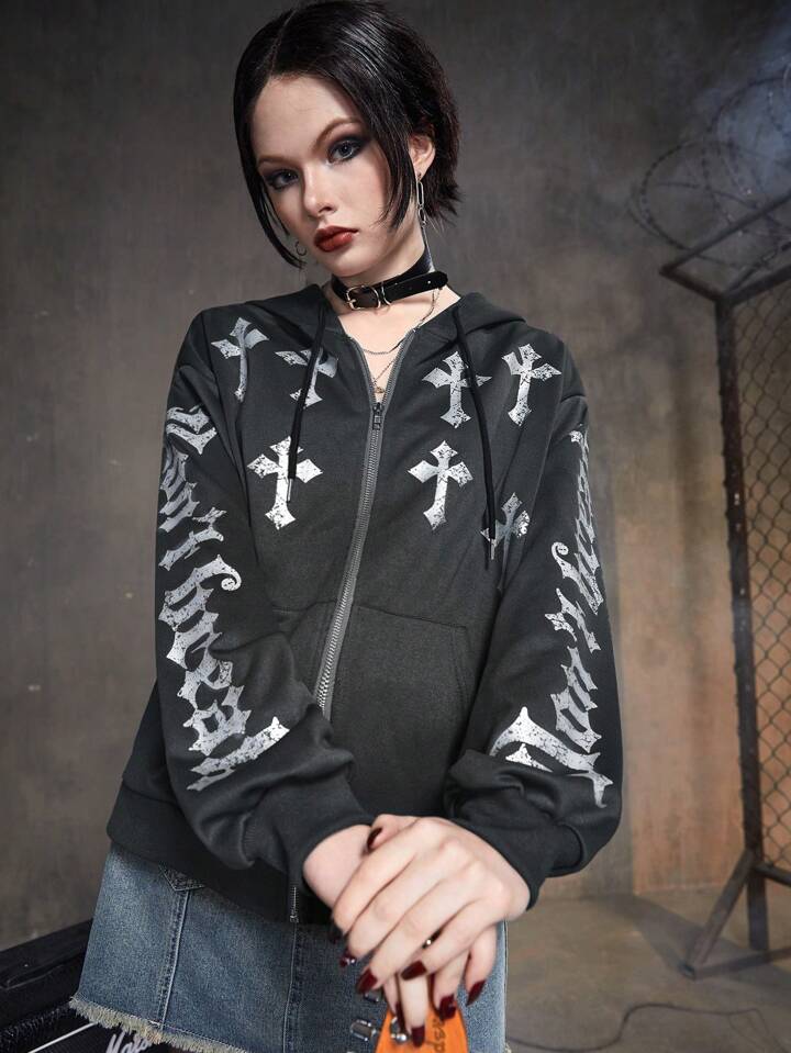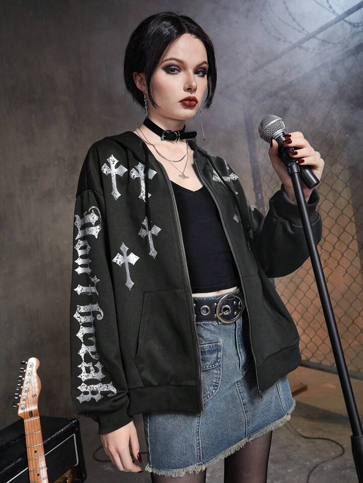 Grunge Punk Felpa con cappuccio lettere incrociato grafico con zip con coulisse