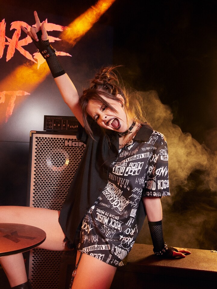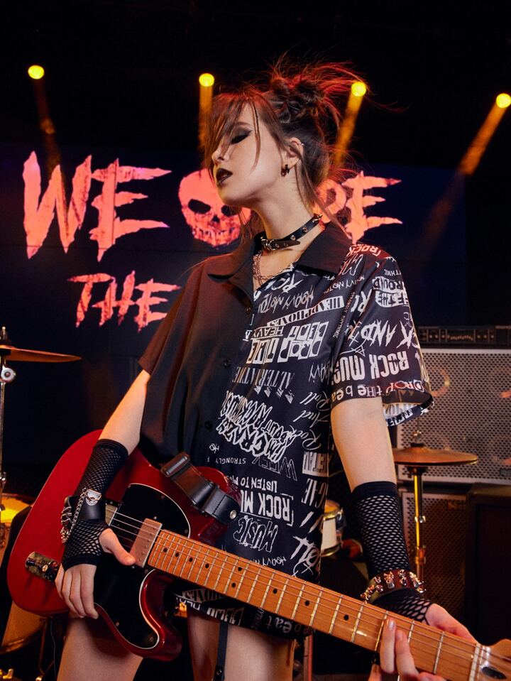 Grunge Punk Camicia con stampa lettera con bottone frontale
