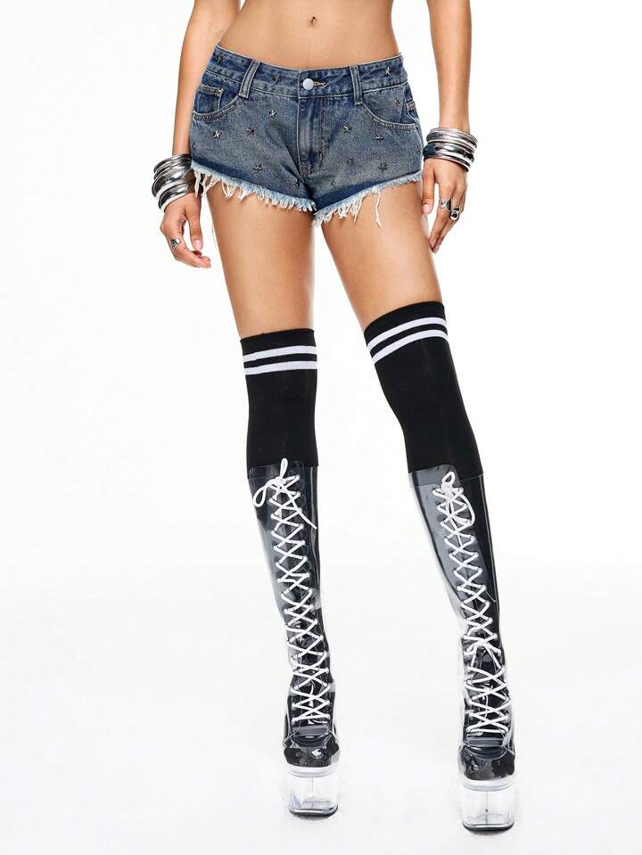 Grunge Punk Jeans di jeans corti super sexy, dal design punk con ribattini e frange, stile Y2K chic e baddie, a vita bassa