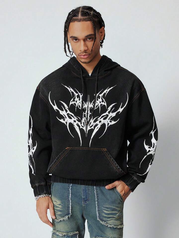 Grunge Punk Giacca di jeans con cappuccio e coulisse, stampa casual da uomo