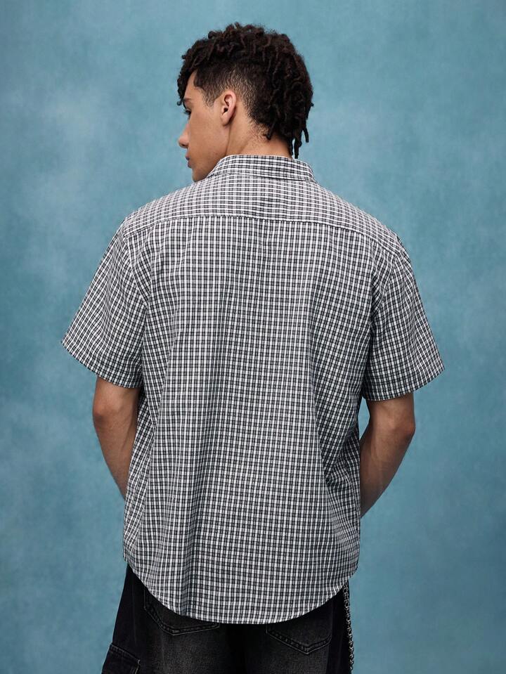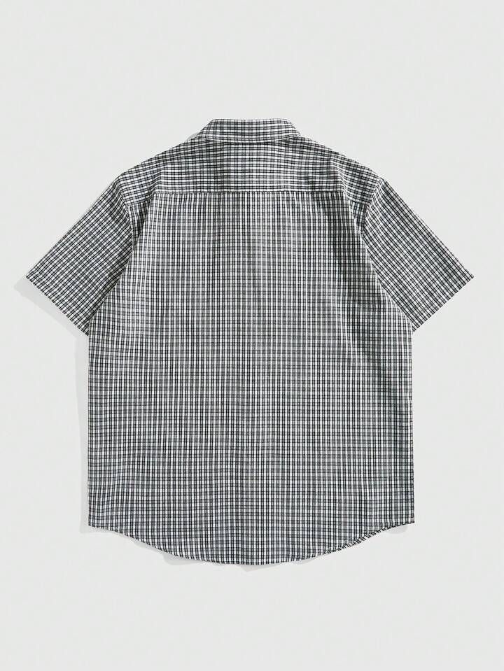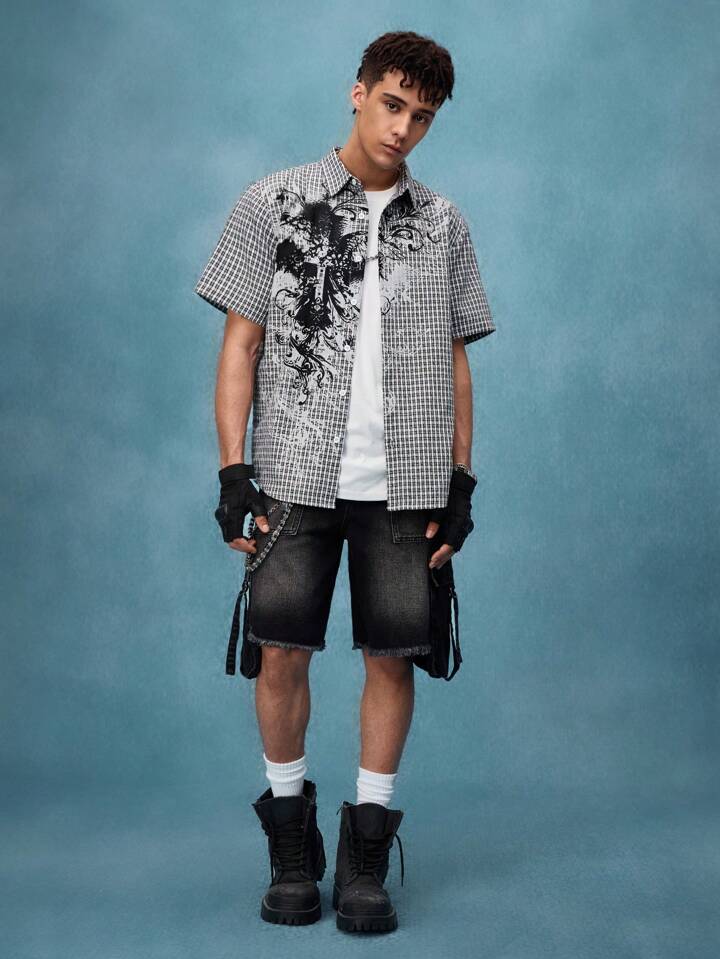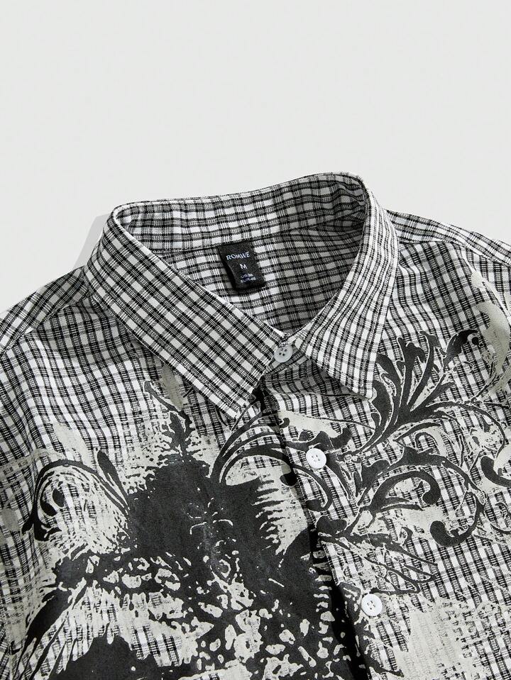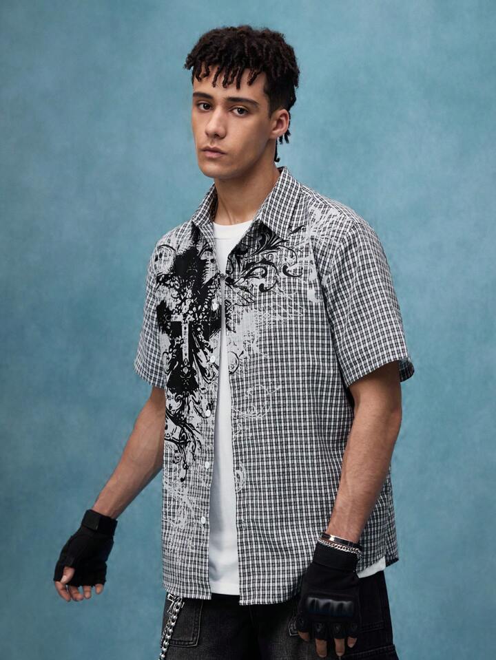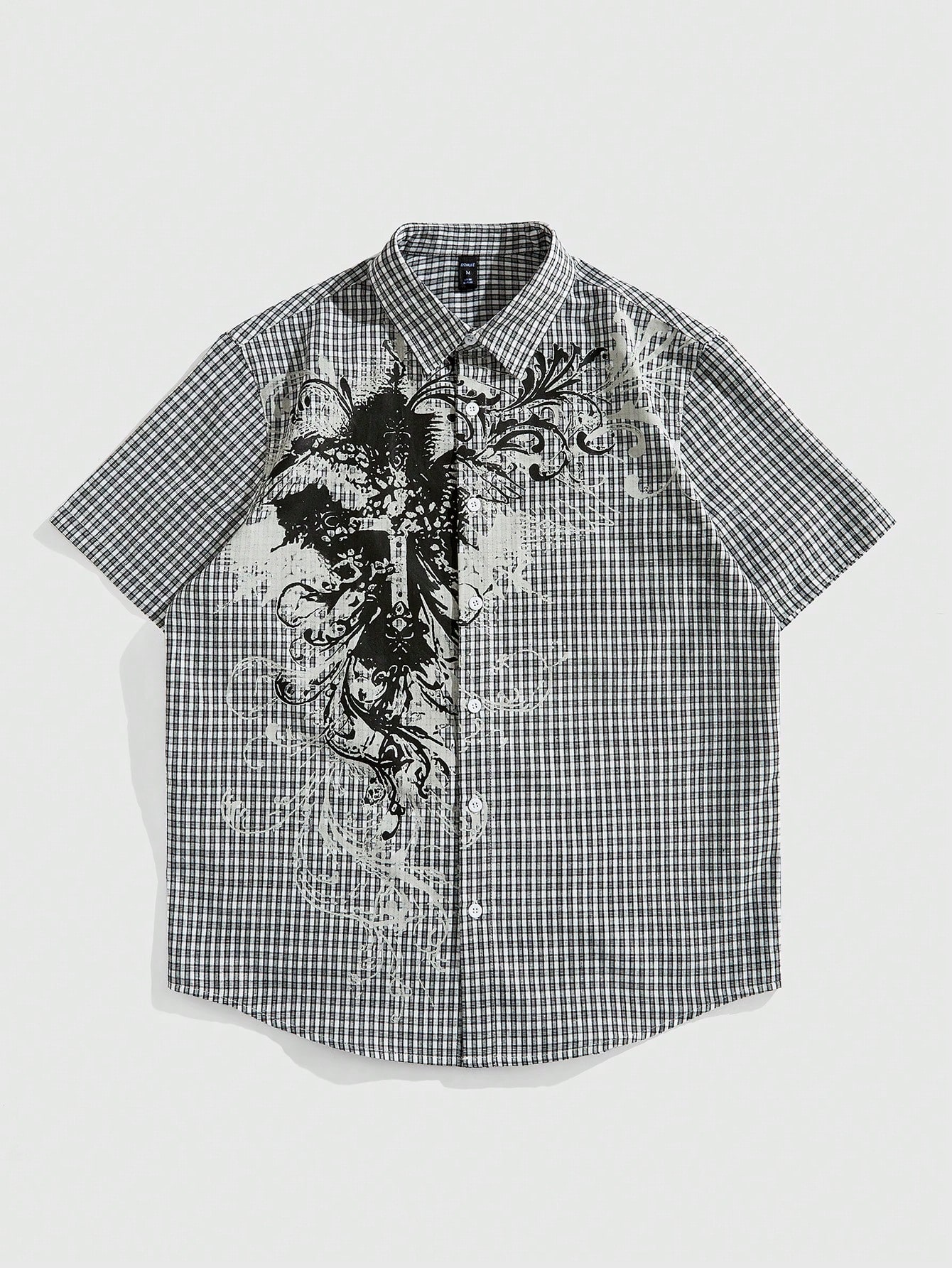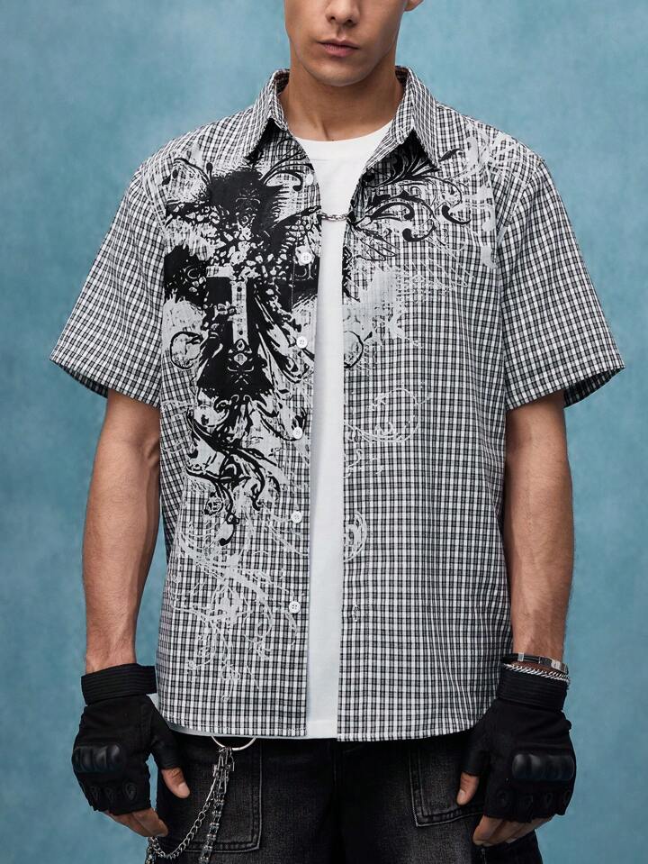 Grunge Punk Camicia casual estiva da uomo a maniche corte, monopetto, con stampa a quadri e croce, stile emo