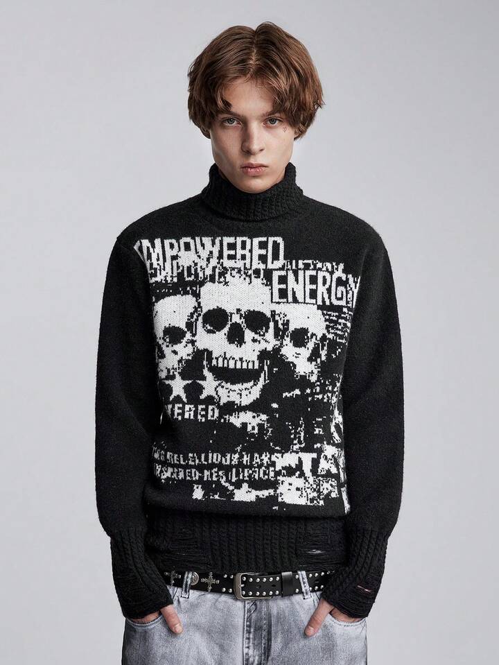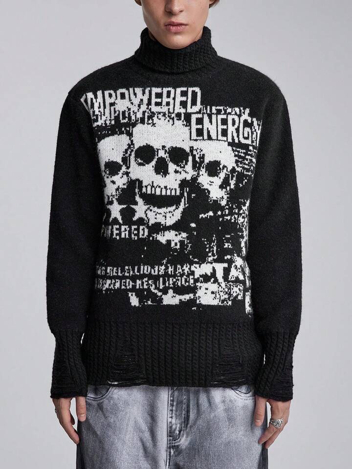 Grunge Punk Maglione girocollo da uomo a maniche lunghe con stampa di lettere e teschi