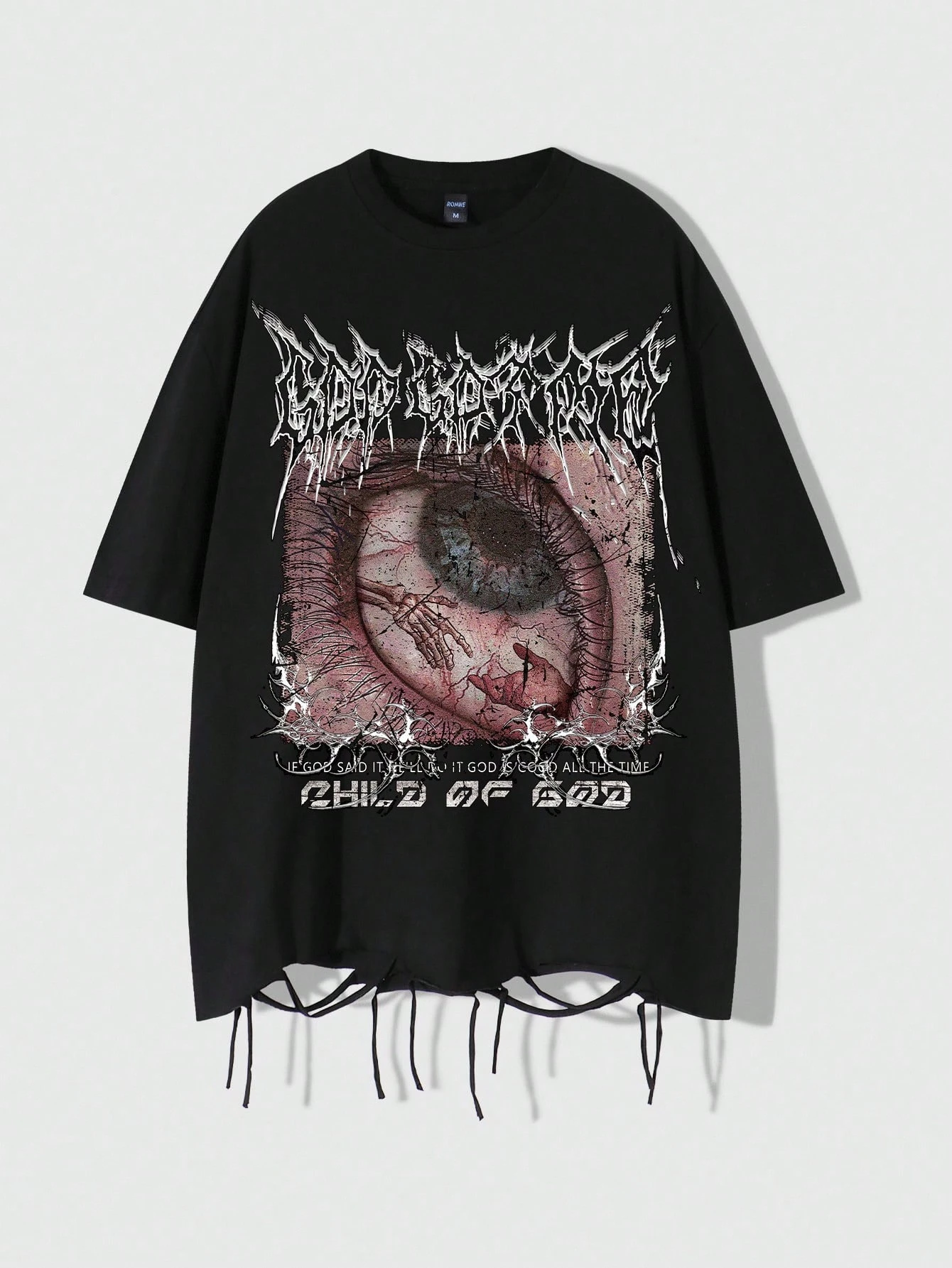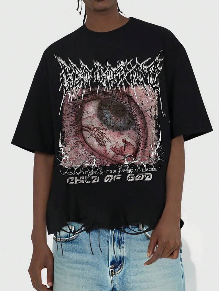 Grunge Punk Maglietta distressed da uomo con design grafico dell'occhio intricato. Il fit morbido e l'aspetto complessivamente distressed conferiscono a questa maglietta un aspetto ribelle e d'avanguardia, adatta agli stili di moda alternativi o punk.