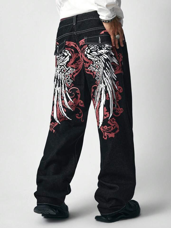Grunge Punk Jeans casual semplici con stampa ad ali, con tasche, da uomo, per uso quotidiano
