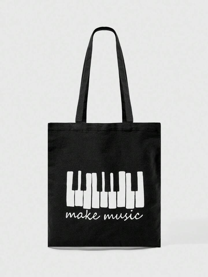 Grunge Punk Borsa a tracolla di grande capacità con stampa minimalista di elementi musicali e lettere di pianoforte in nero, casual e versatile per pendolarismo, adatta per scuola, shopping, uscite, feste, unisex