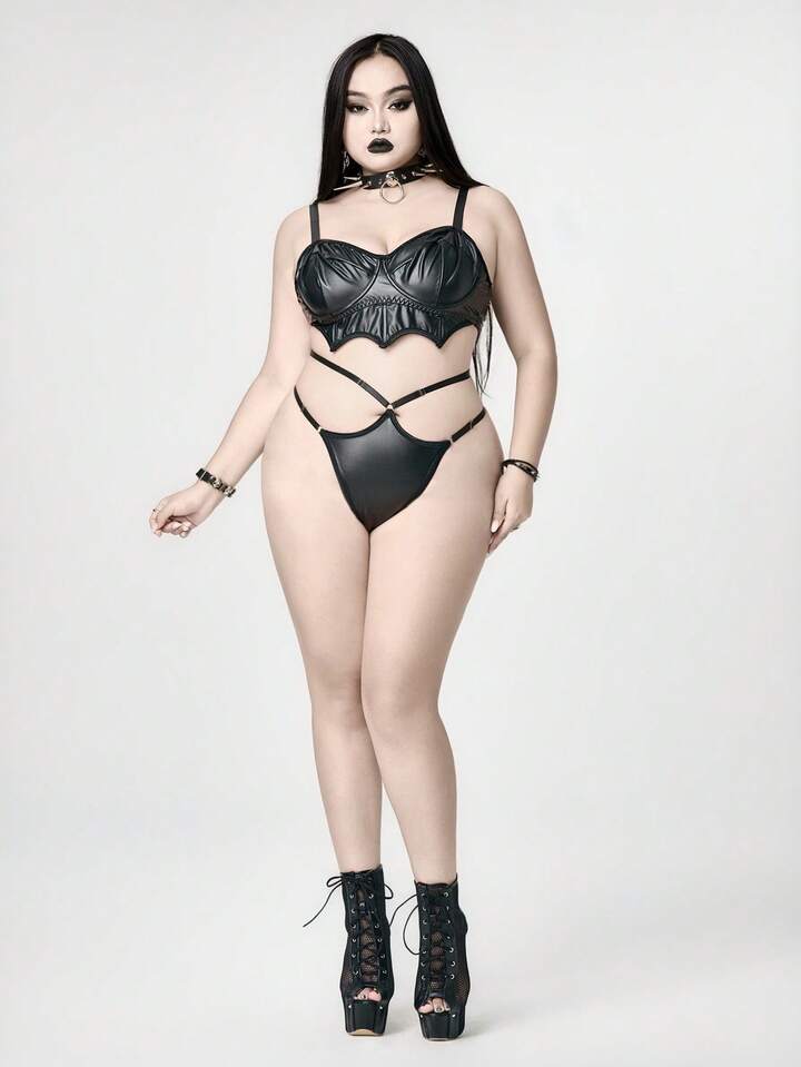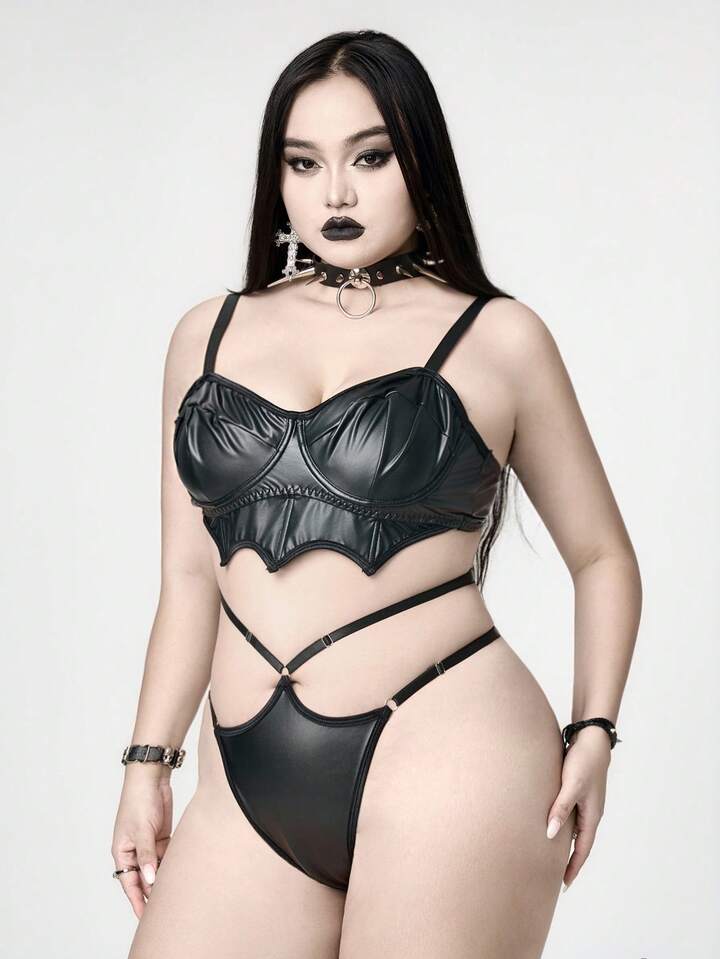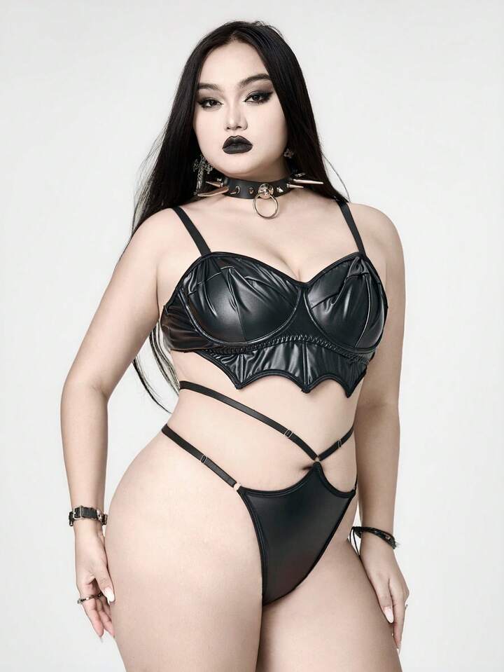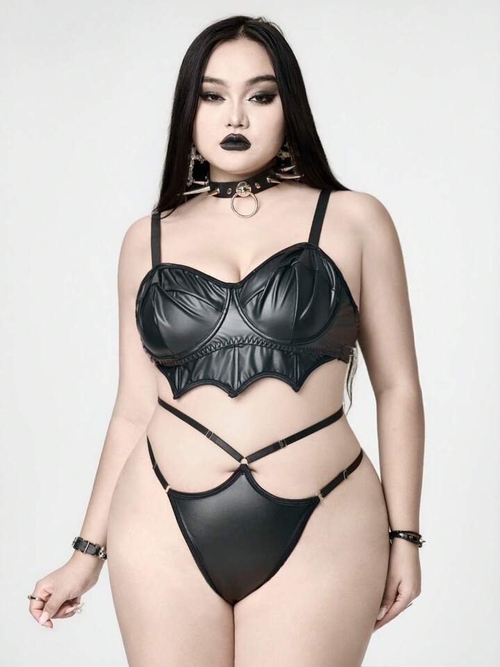 Grunge Punk Set di lingerie sexy con reggiseno a fascia con ali a pipistrello in PU, con spalline strette, per taglie forti, stile punk scuro