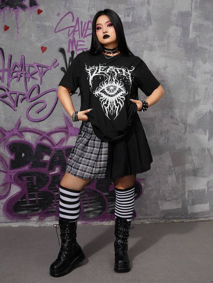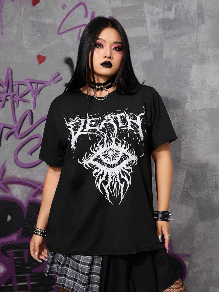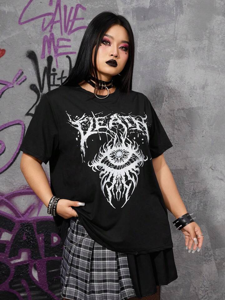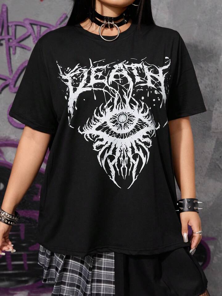 Grunge Punk T-shirt A Manica Corta E Taglia Comoda Con Stampa Occhio Punk Scuro Per Donne Taglie Forti