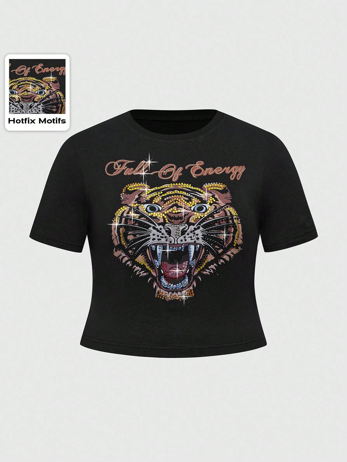 Grunge Punk T-shirt aderente taglie forti con stampa di tigre e strass in stile Y2K, vintage e sexy