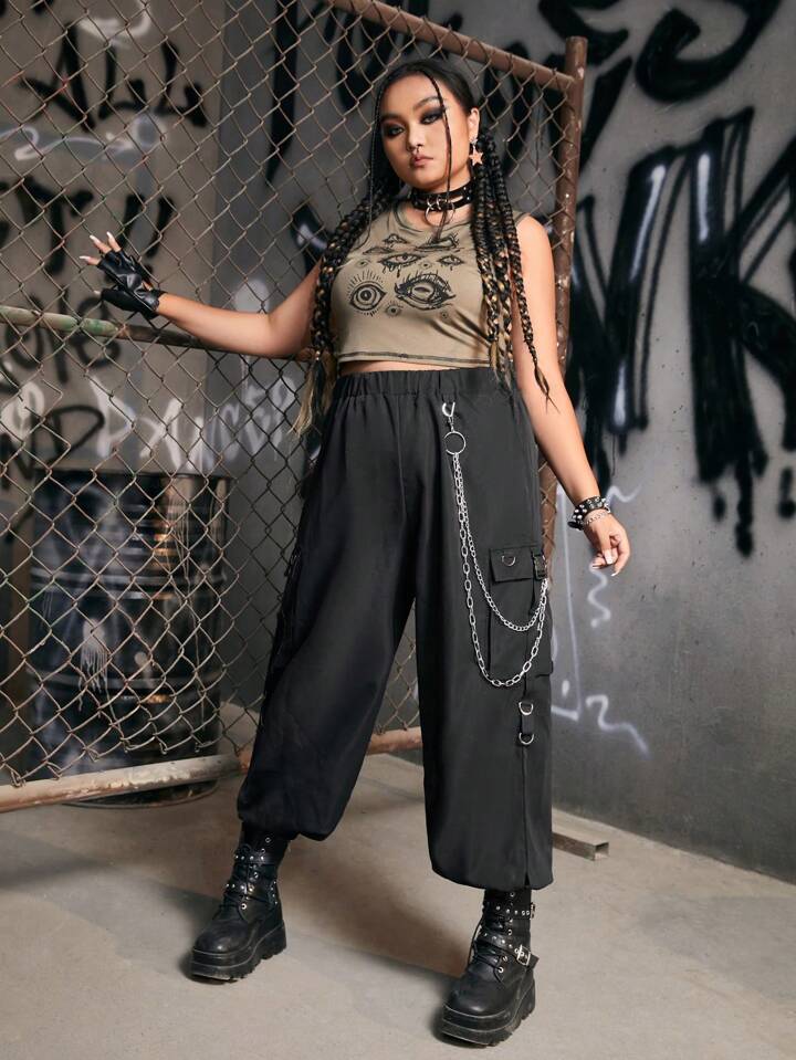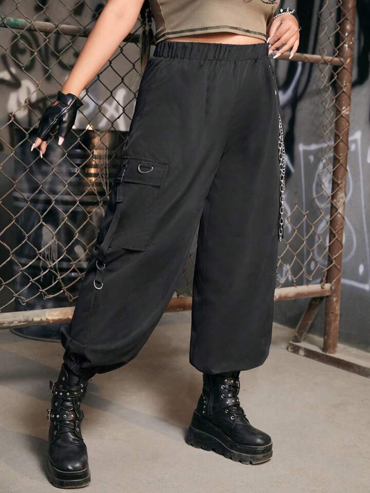Grunge Punk Taglie Forti Pantaloni cargo monocolore dettaglio catena