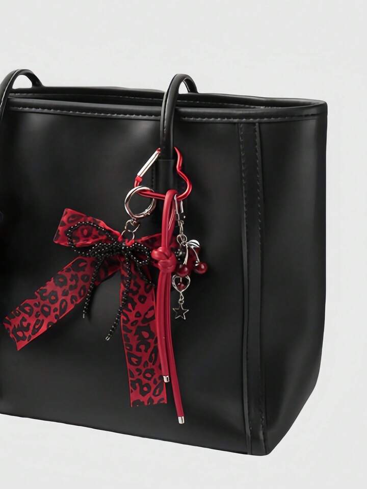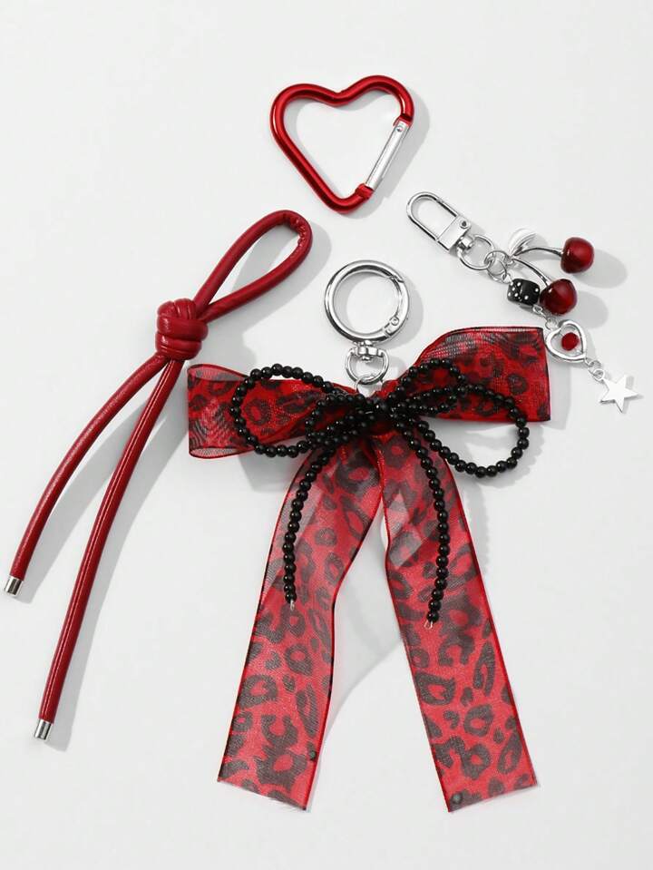 Grunge Punk Ciondolo goth popolare per borsa, con perline nere, fiocco a motivo leopardato, nappe, catena, lucchetto a forma di cuore e cigliegia