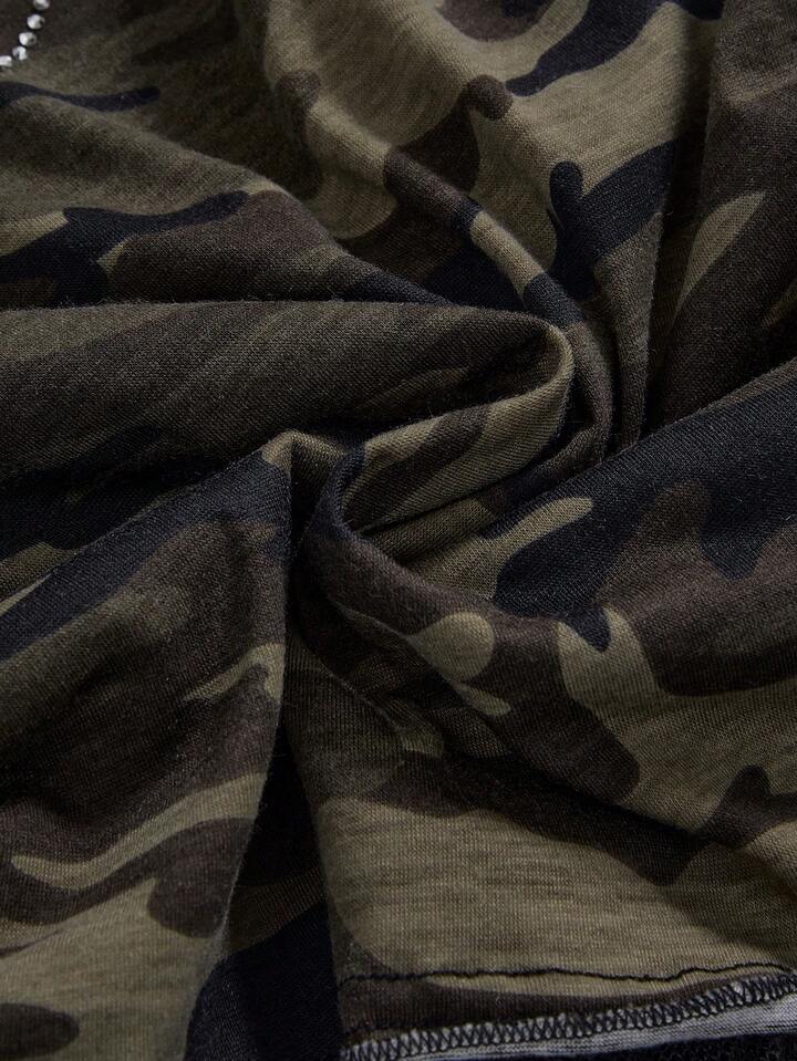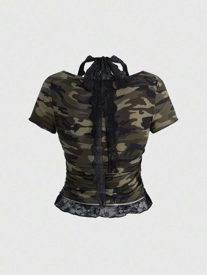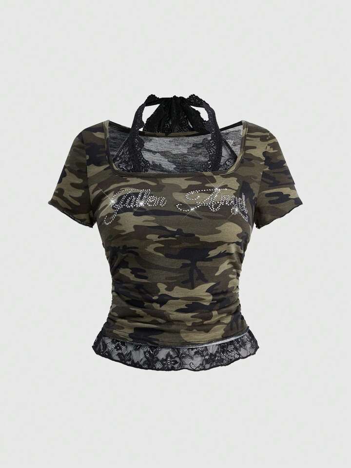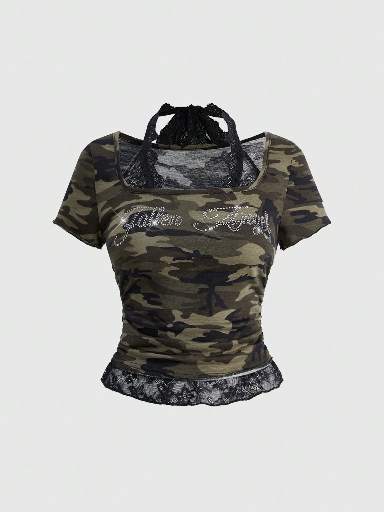 Grunge Punk T-shirt aderente da donna con collo a equipaggio, con grafica punk, applicazioni di strass, camouflage e inserti in pizzo