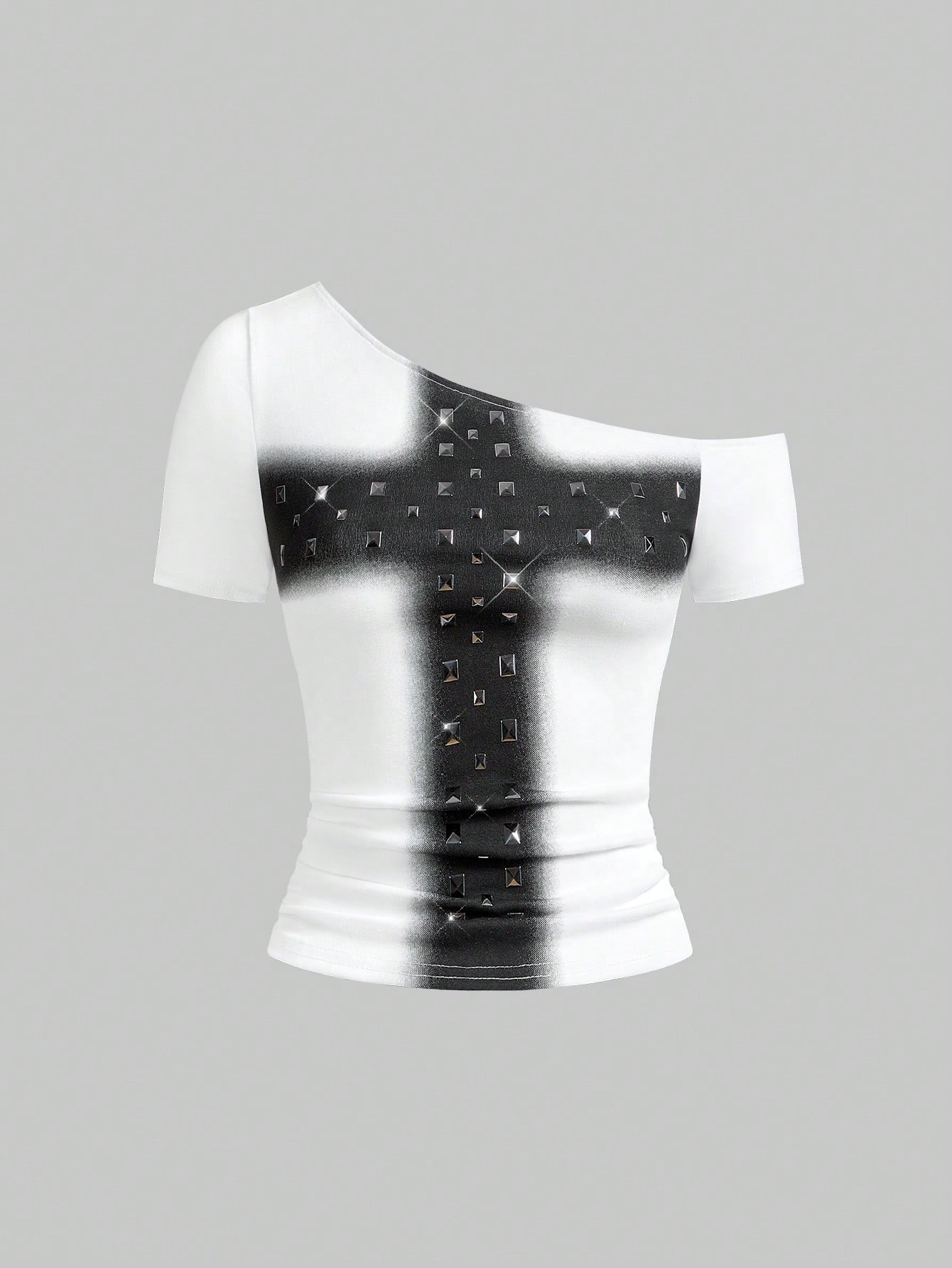 Grunge Punk T-shirt aderente con stampa a croce e borchie in stile punk