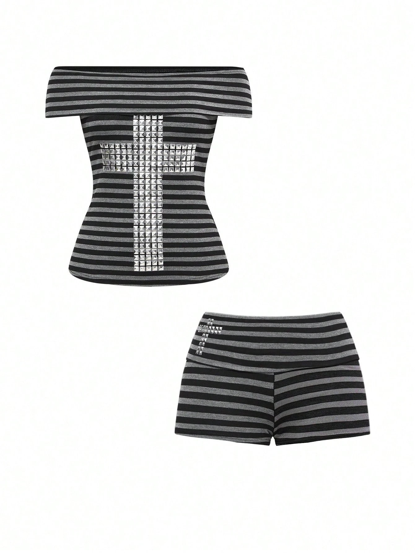 Grunge Punk Set di 2 pezzi composto da top a spalle scoperte con rivetti e righe in stile punk sexy Y2K e mini shorts a vita super bassa