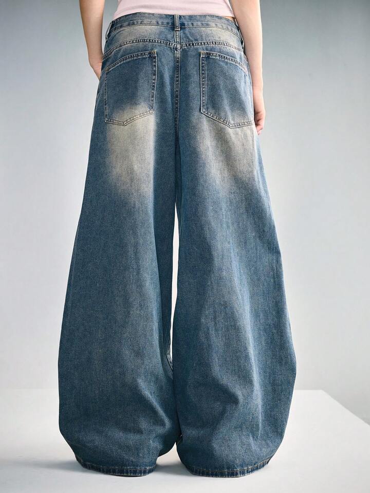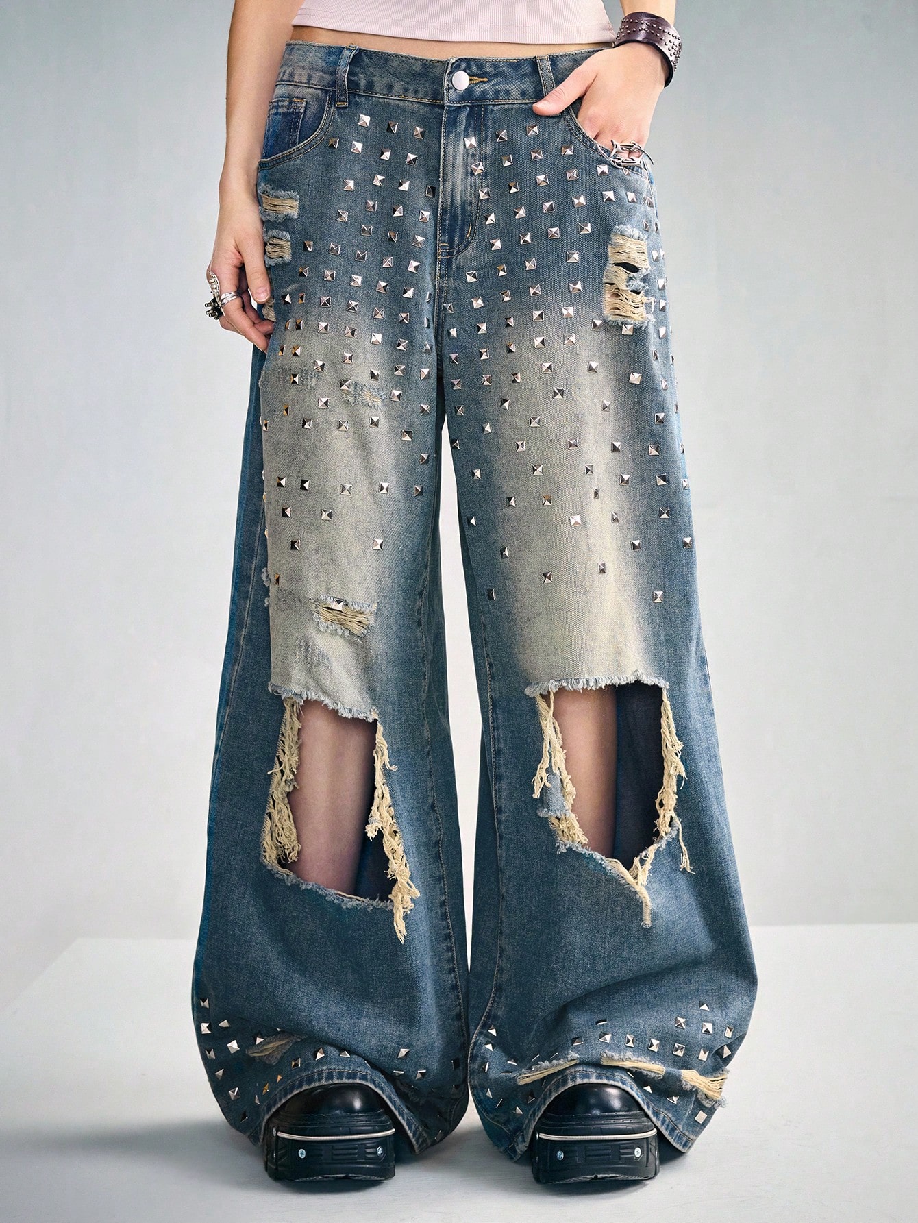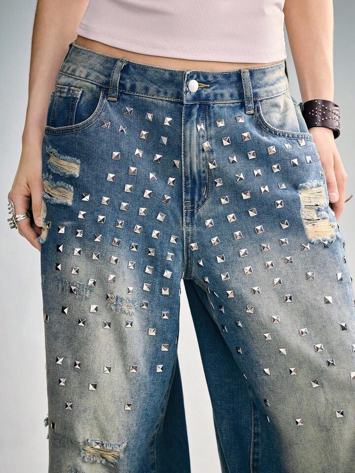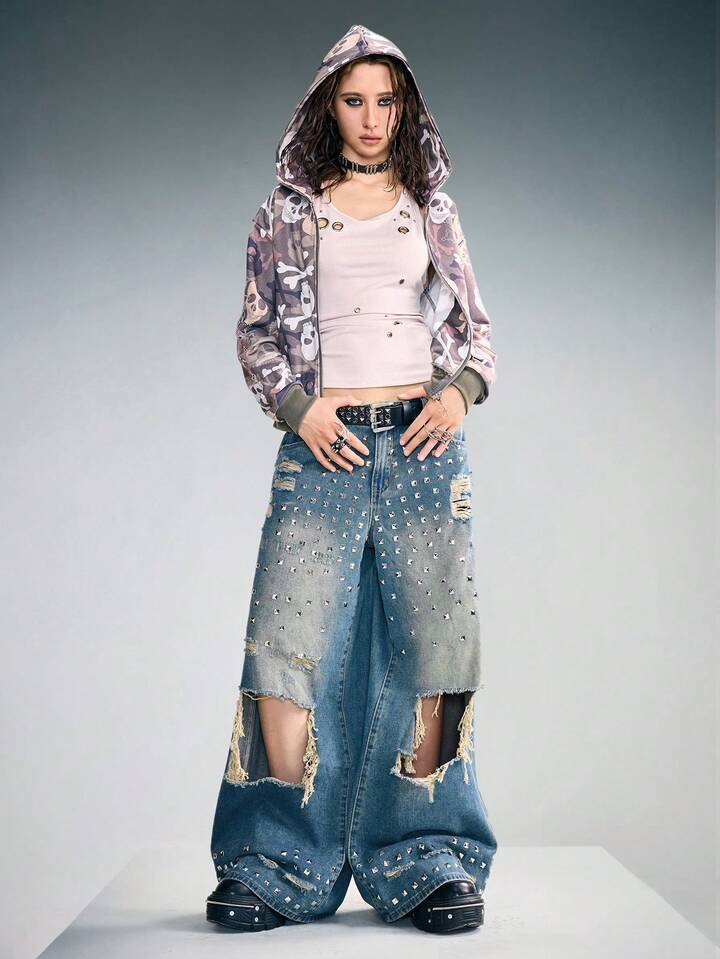 Grunge Punk Jeans larghi e sfilacciati in stile punk, con gamba ampia, unisex