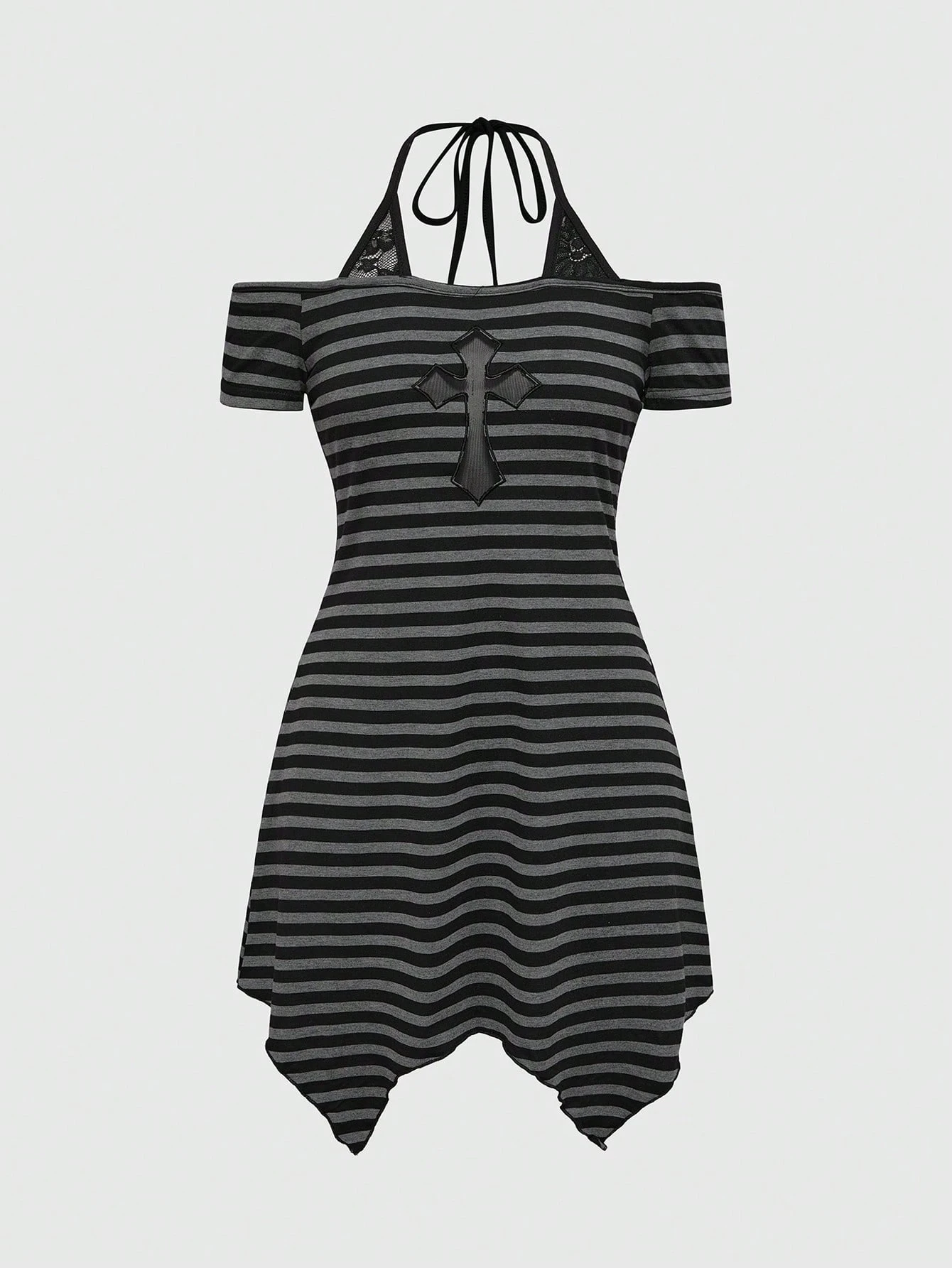 Grunge Punk Vestito estivo da donna in stile punk, outfit per San Valentino o vacanze al mare, senza maniche, con spalle scoperte, orlo asimmetrico, con inserti in pizzo, ricamo a croce e motivo a righe, mini abito con spalline a spaghetti