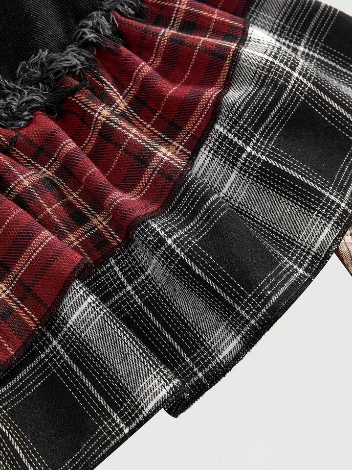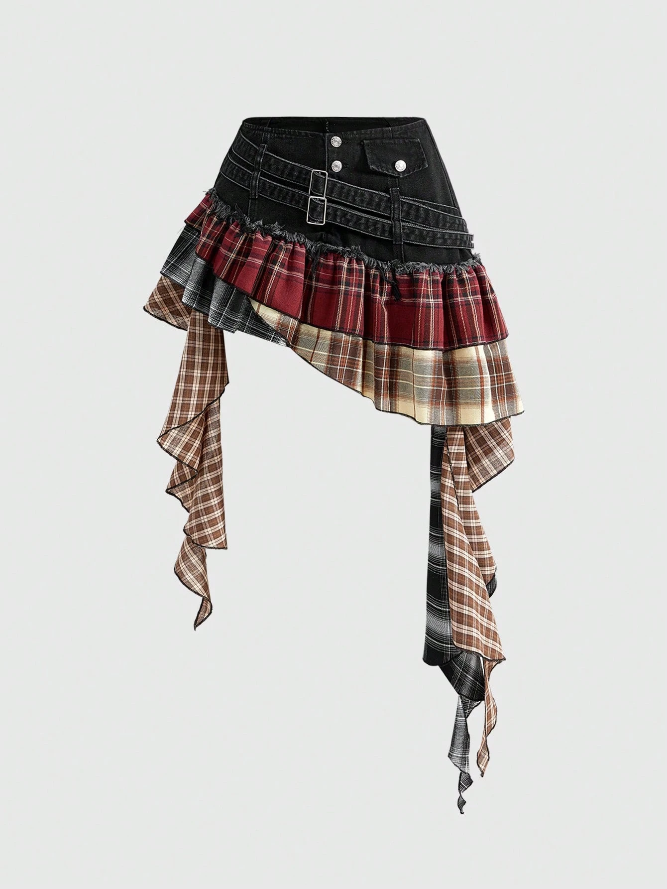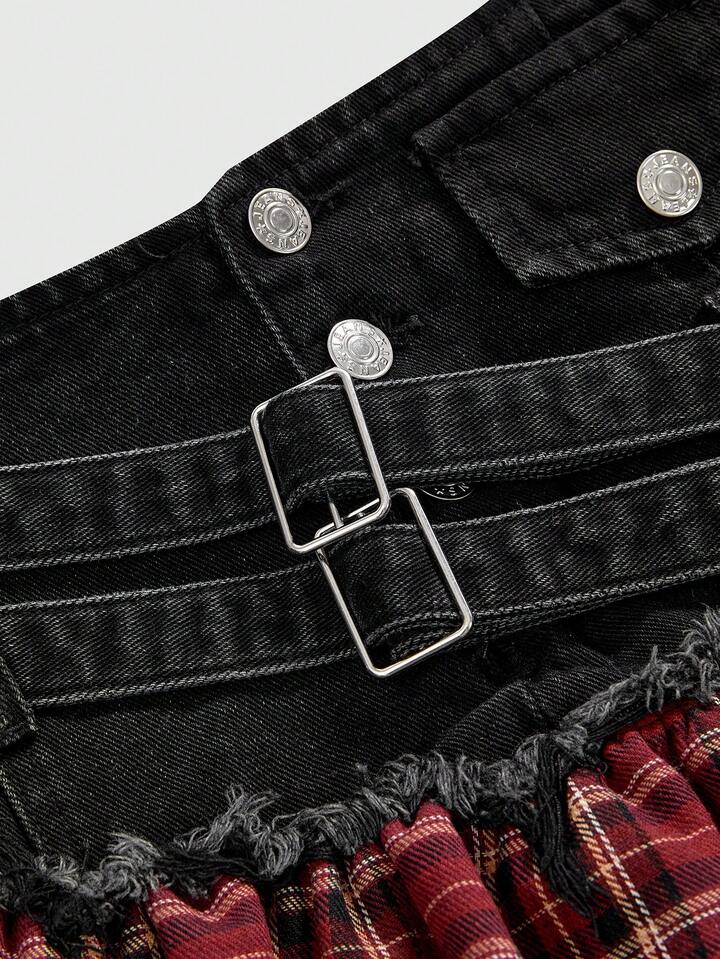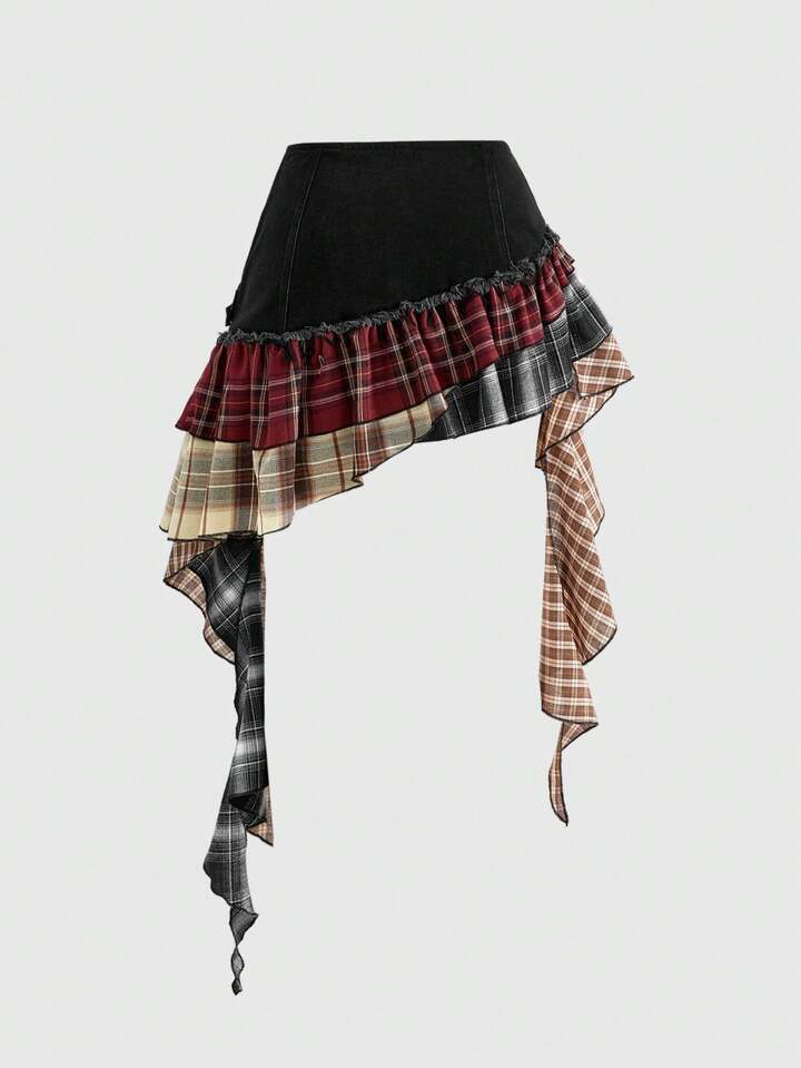 Grunge Punk Gonna di jeans mini asimmetrica con volant, in stile retrò punk a quadri patchwork
