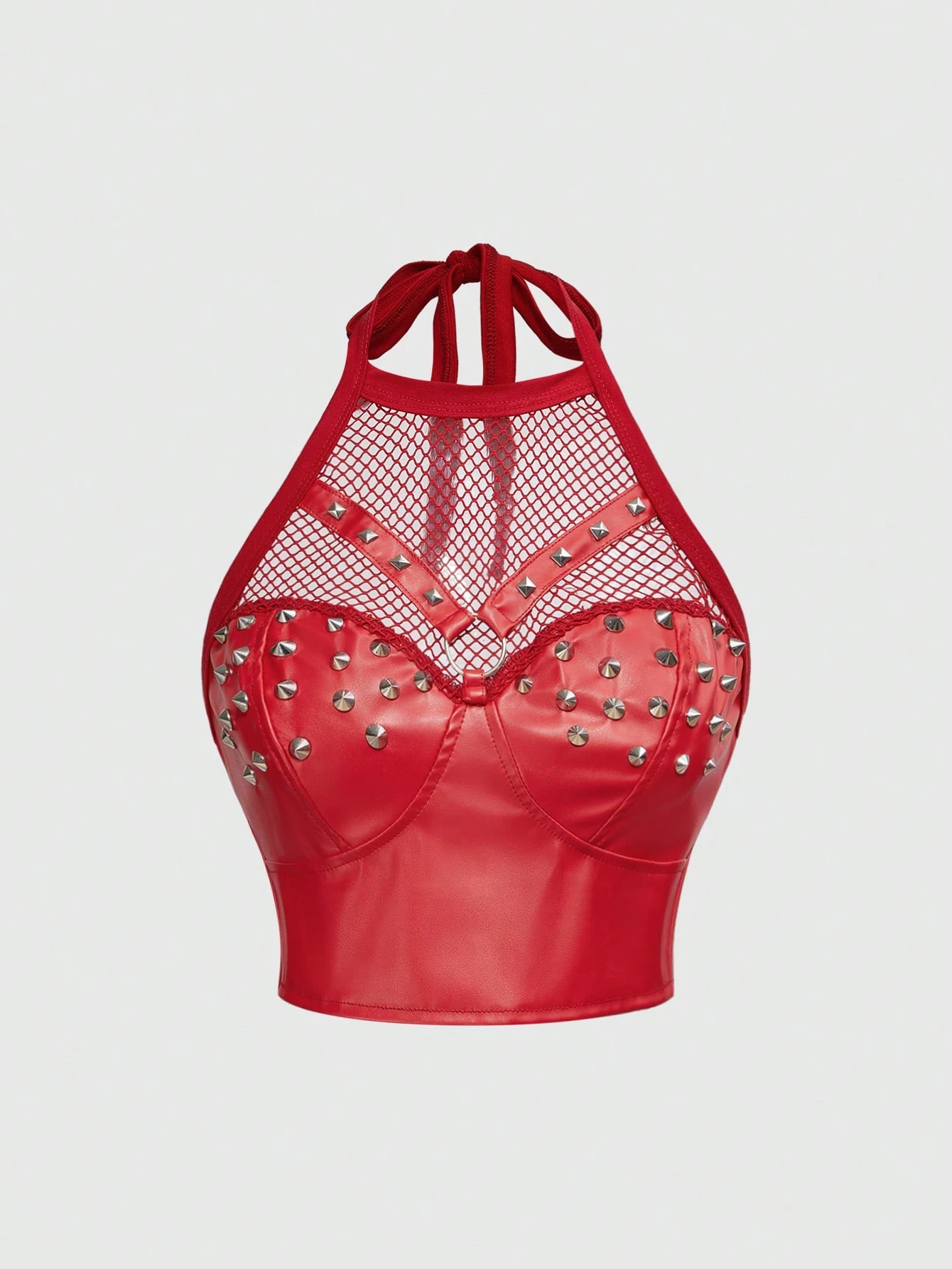Grunge Punk Canottiera aderente in PU con scollo alto, con elementi in metallo e rete, in stile punk sexy