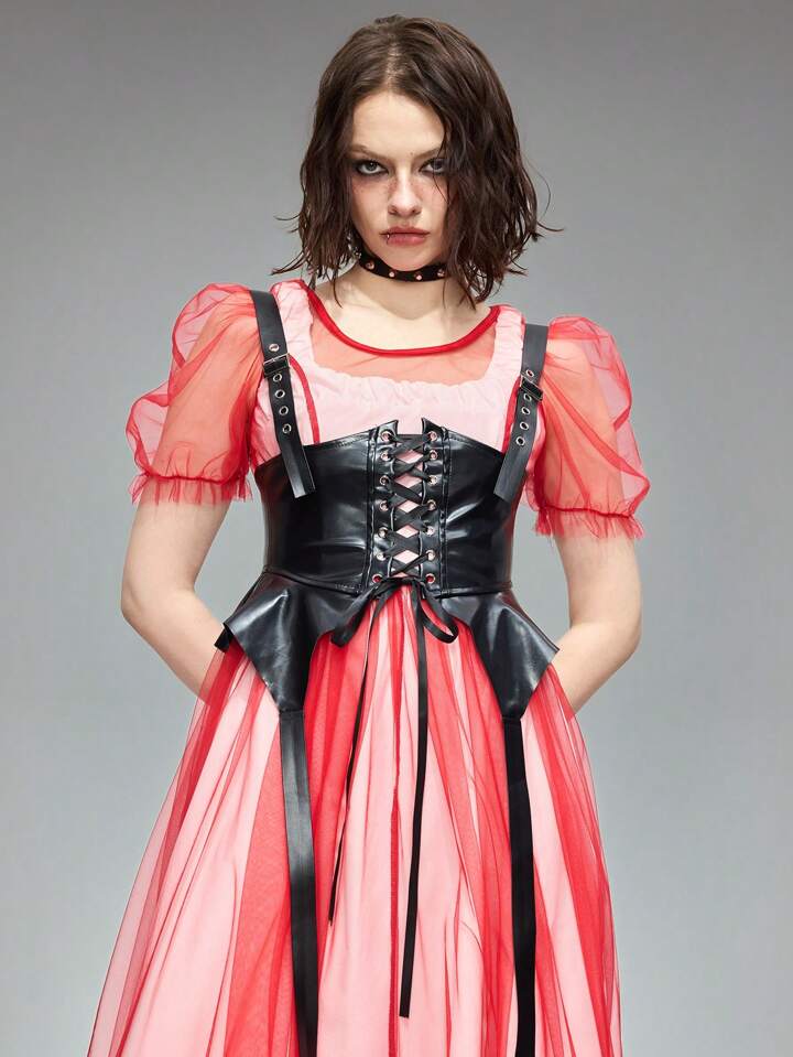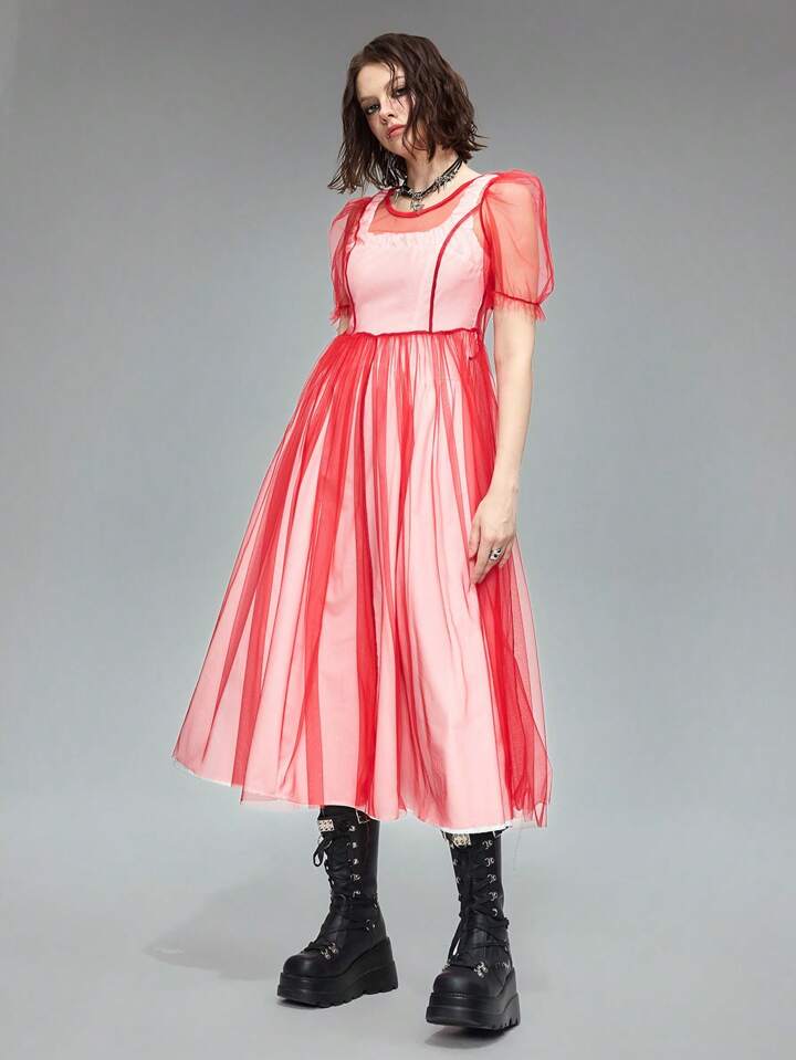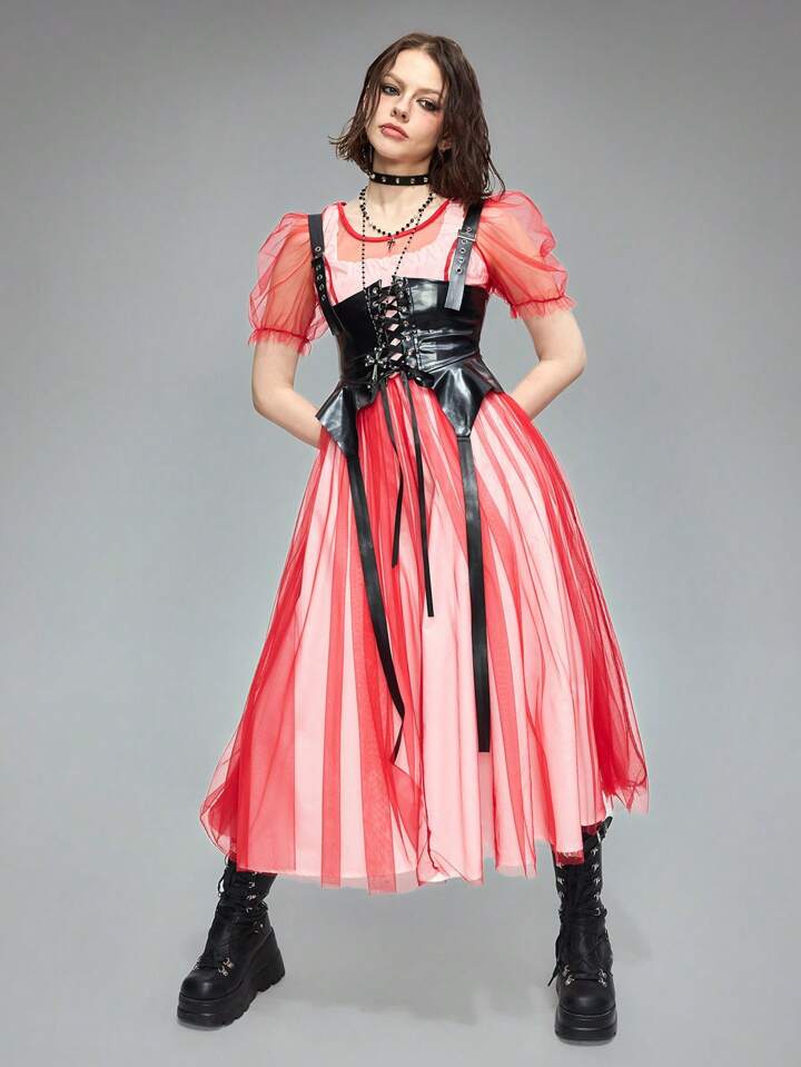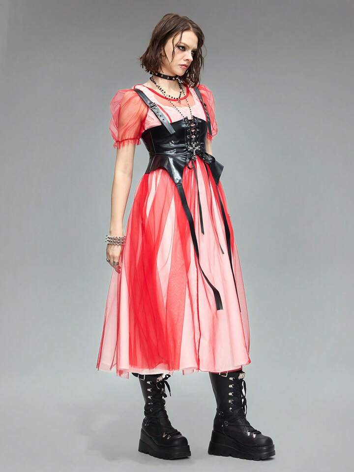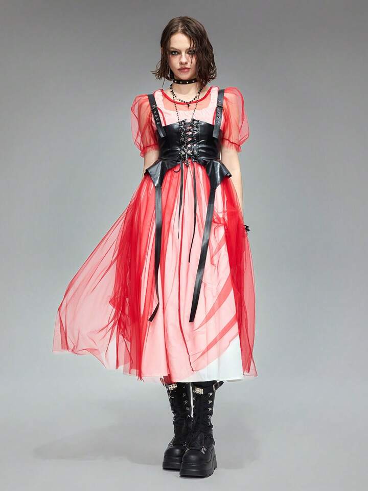 Grunge Punk Abito lungo estivo sexy, trasparente, in stile gotico con maniche a palloncino in rete, adatto per occasioni di festa come la stagione delle lauree