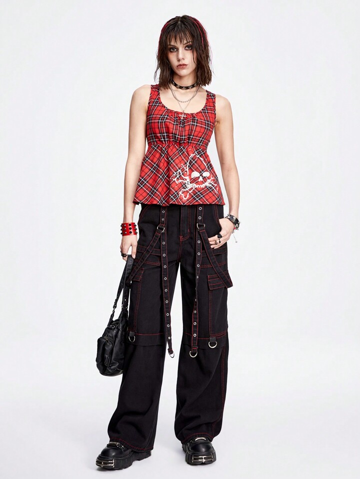 Grunge Punk Canotta aderente stampata con teschio sexy e dolce con scollo a quadrato e modello a quadri plissettato per donne