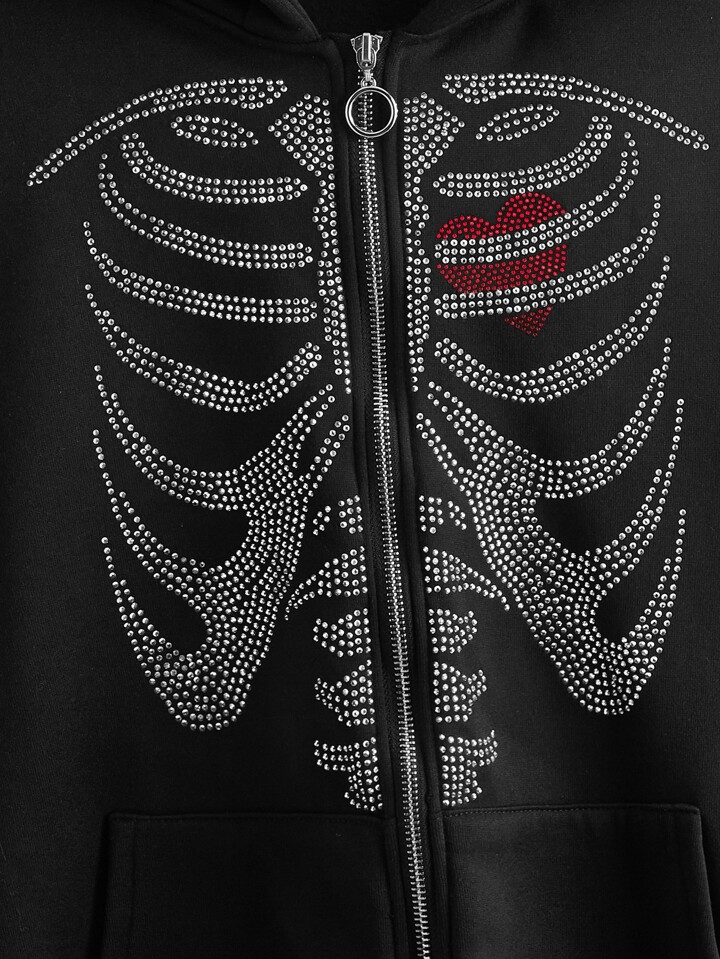 Grunge Punk Felpa con chiusura lampo e strass a forma di scheletro e cuore, per la scuola