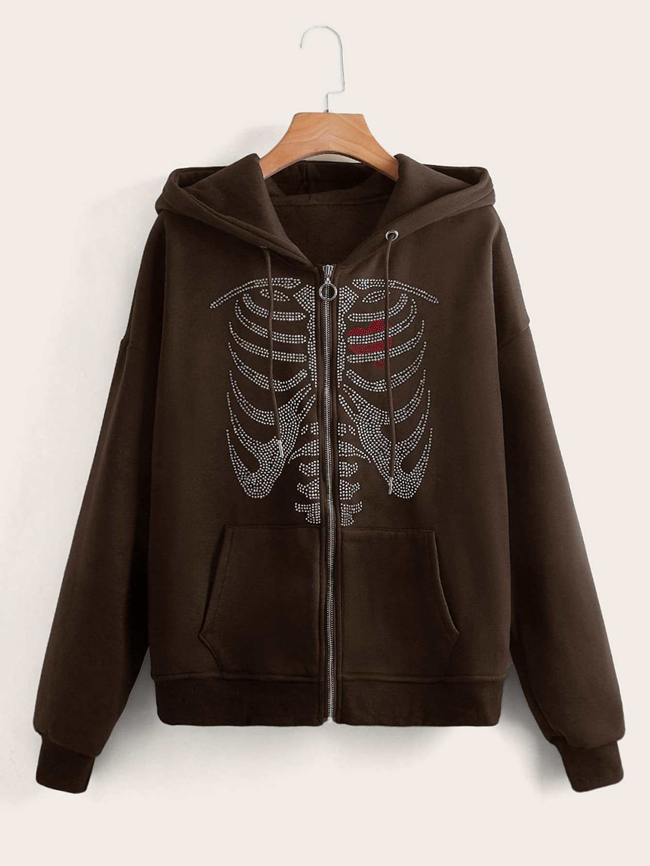 Grunge Punk Felpa con cappuccio scheletro con strass con zip tasca con coulisse