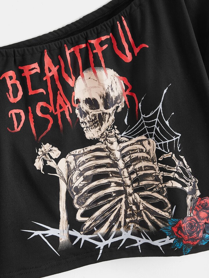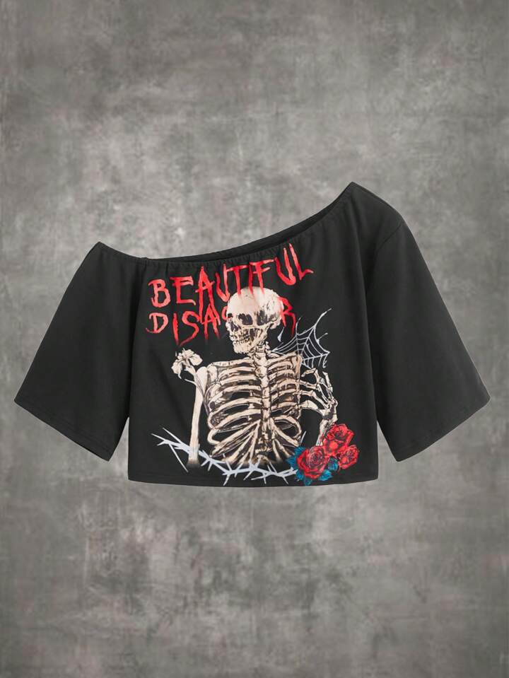 Grunge Punk T-shirt corta asimmetrica con stampa di teschio e fiori, per la scuola