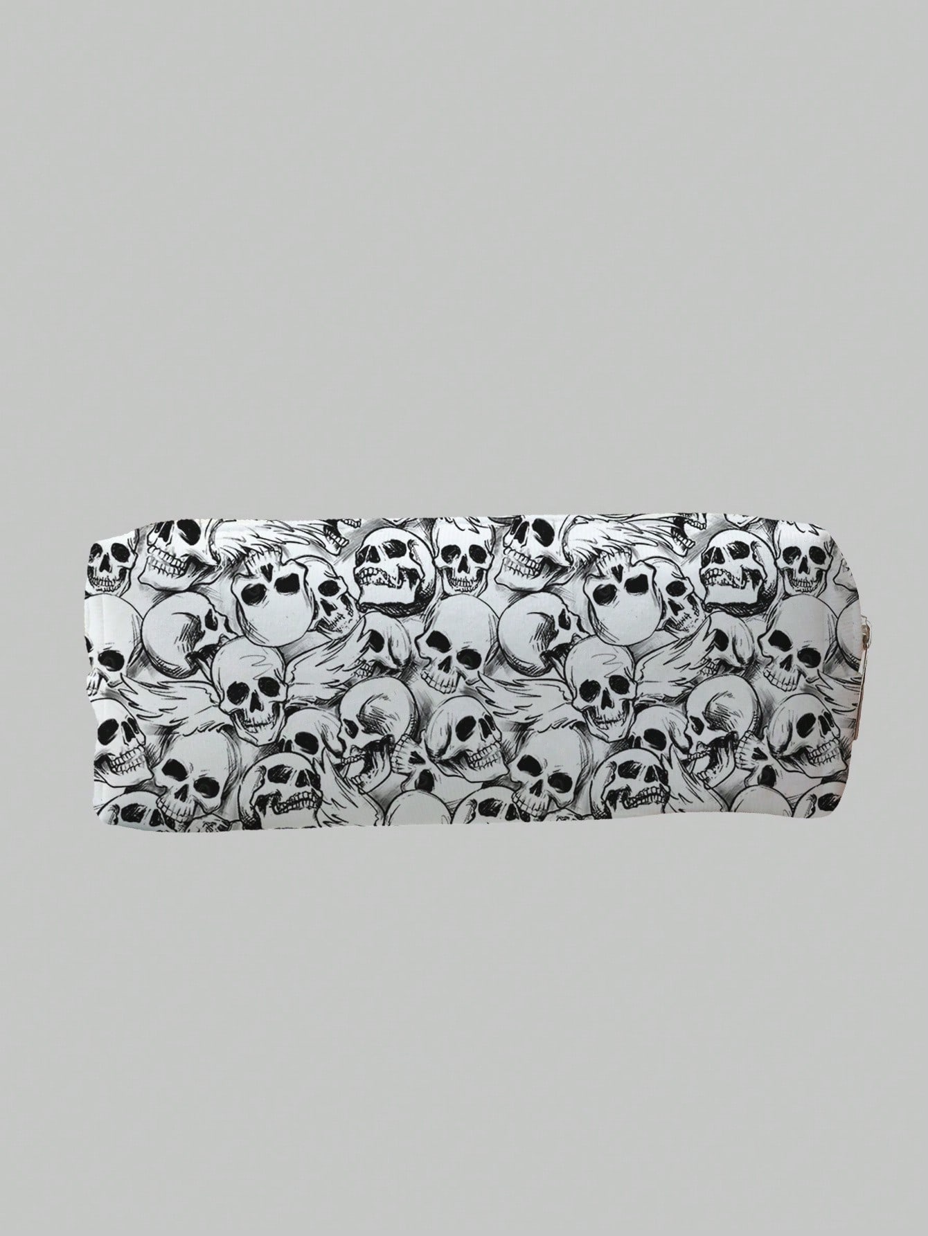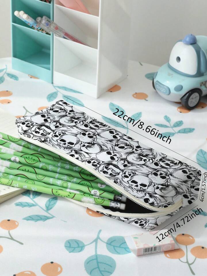 Grunge Punk Trousse À Stylo À Double Face Imprimée En Motifs De Crânes Dessinés À La Main