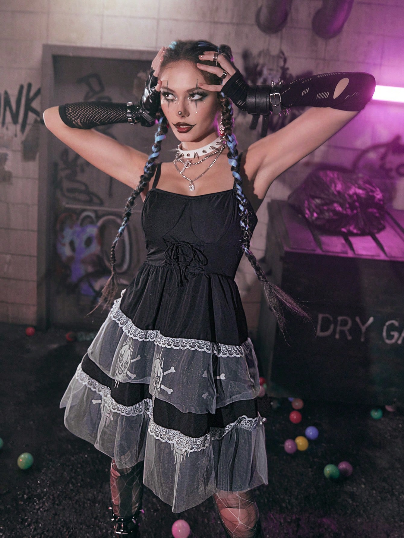 Grunge Punk Abito con bretelle sottile con stampa teschi con lacci tulle a contrasto