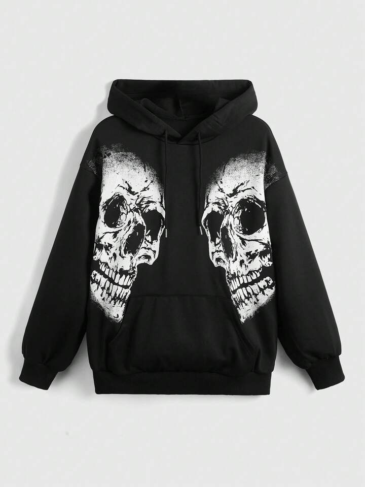 Grunge Punk Felpa Con Cappuccio Stampata Con Teschio E Design Con Coulisse