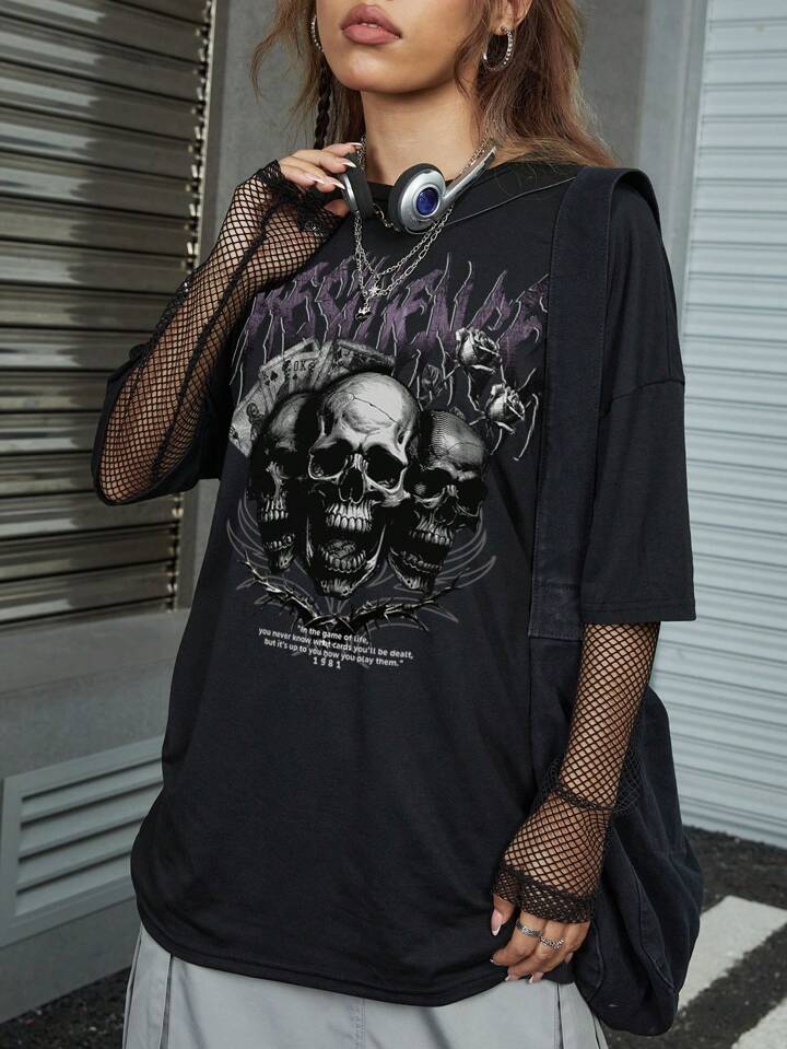 Grunge Punk Maglietta con spalla cadenti teschio & con grafica slogan