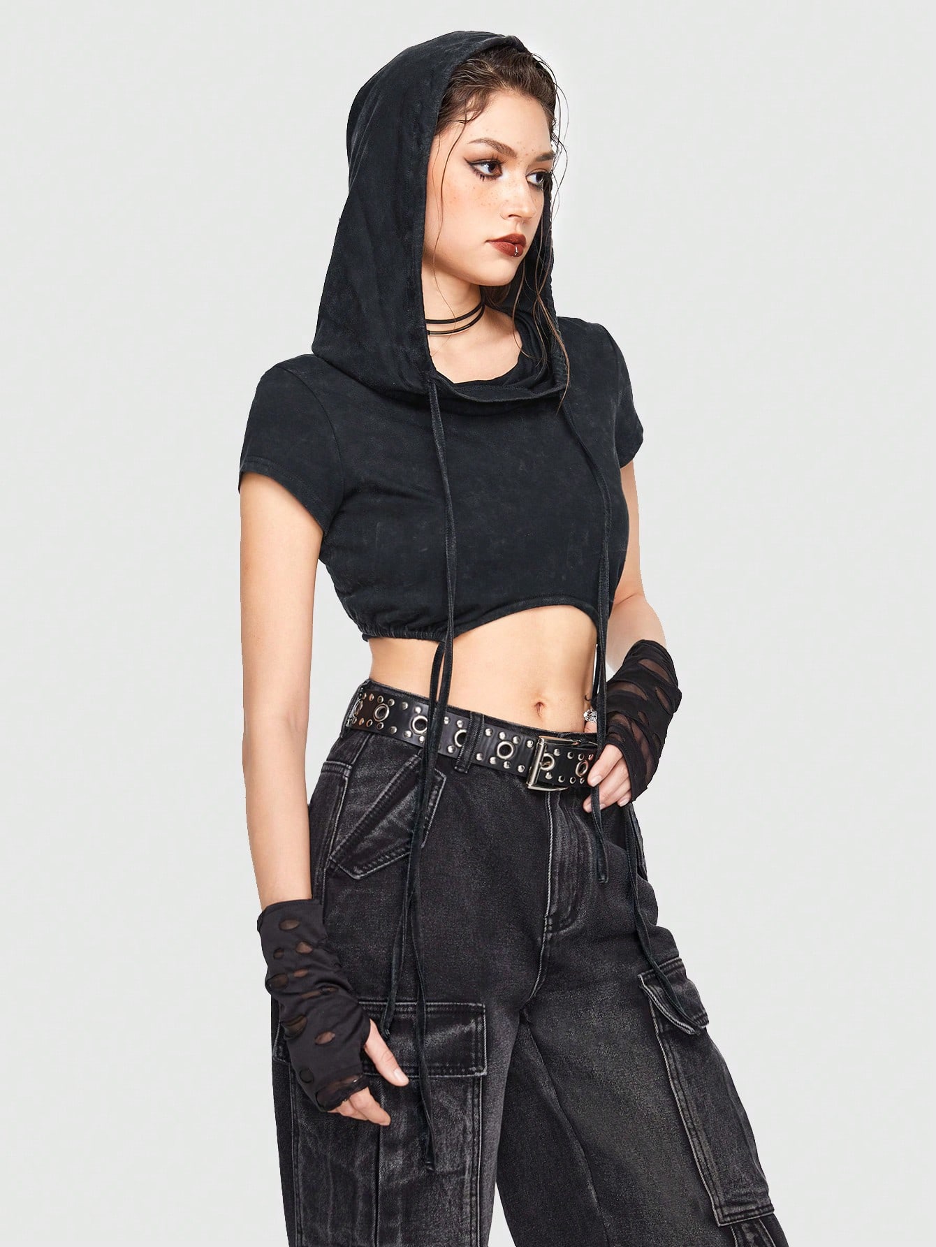 Grunge Punk Maglietta corta monocolore con coulisse con cappuccio
