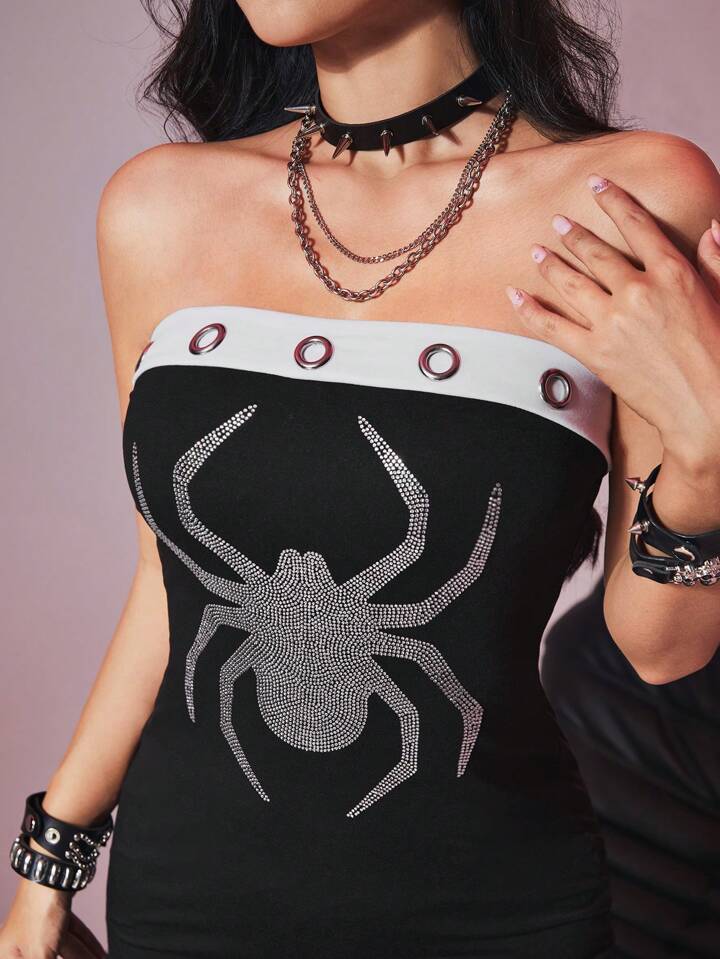 Grunge Punk Vestito Aderente Senza Spalline Da Donna Con Rivetti In Metallo, Strass E Disegno Di Ragno