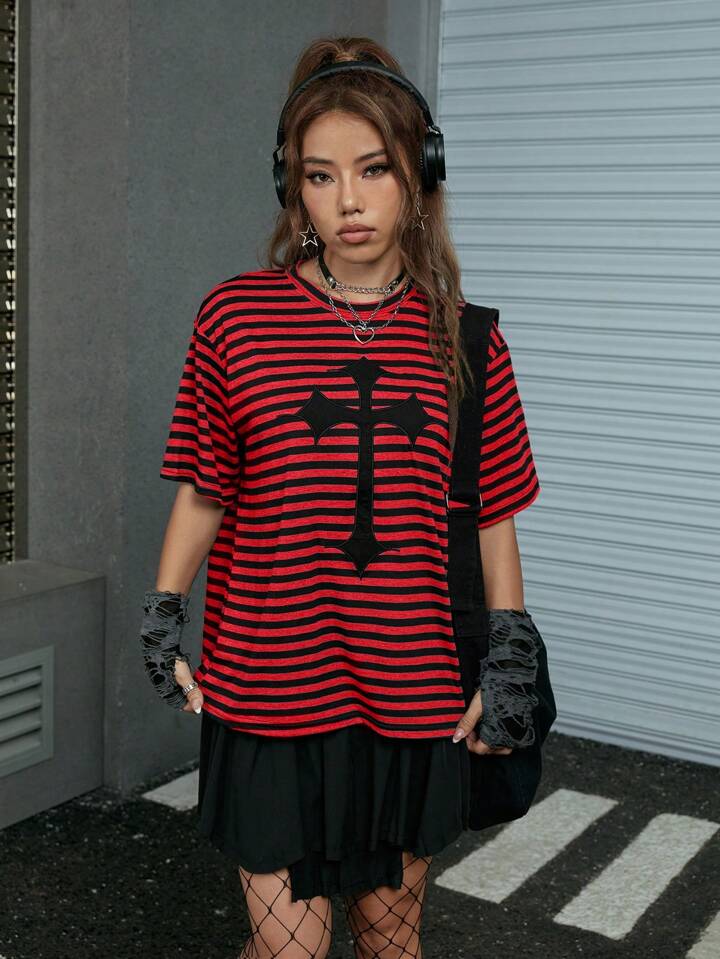 Grunge Punk Maglietta righe & incrociato stampa