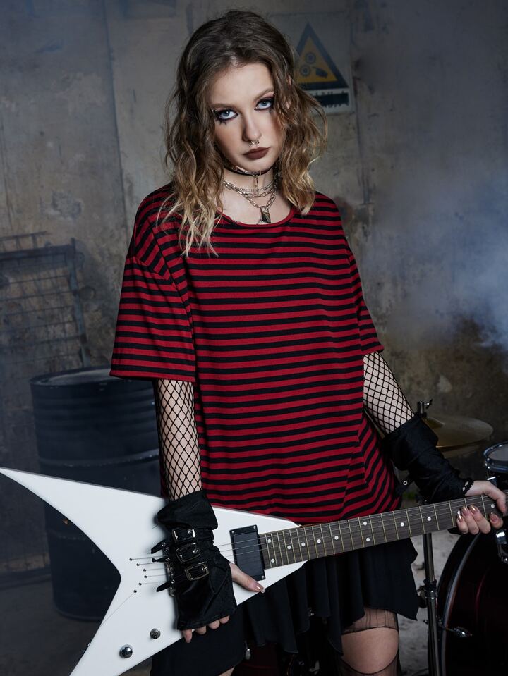 Grunge Punk T-shirt a righe con spalle a goccia, per la scuola