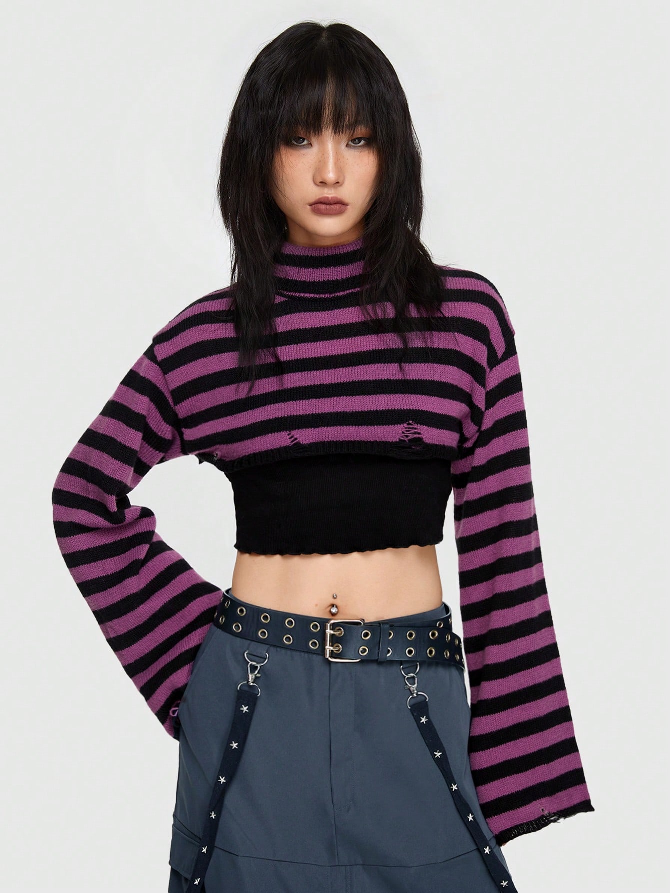 Grunge Punk Maglione corto modelli righe dolcevita spalle cadenti con strappati