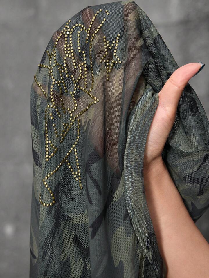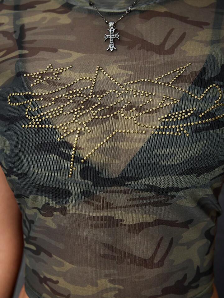 Grunge Punk Top corto attillato da donna in stile Y2K, sexy, con rete, stampa mimetica e borchie