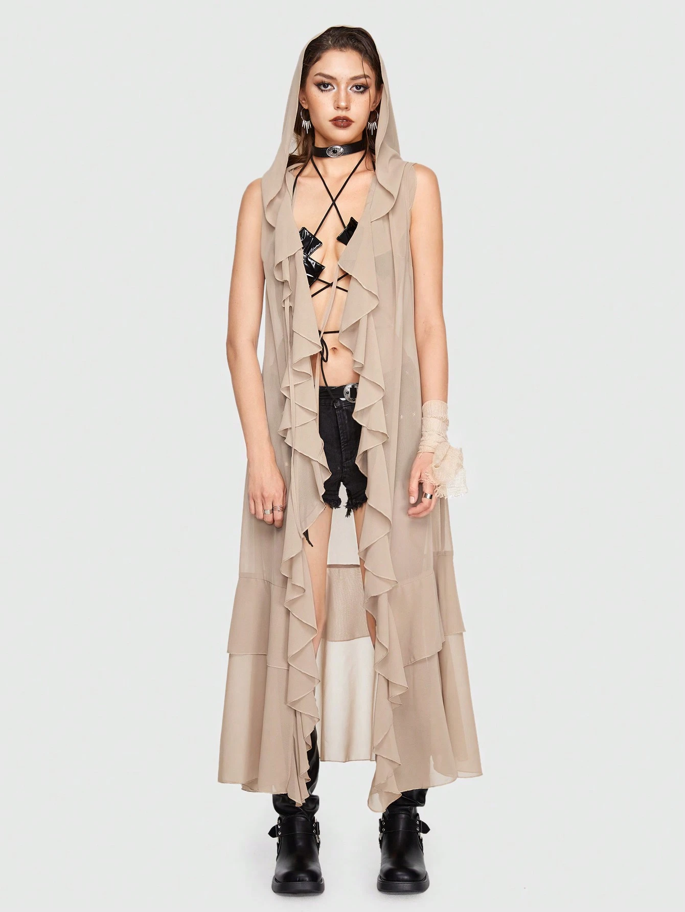 Grunge Punk Top con nodo frontale con bordo a volant con cappuccio lungo