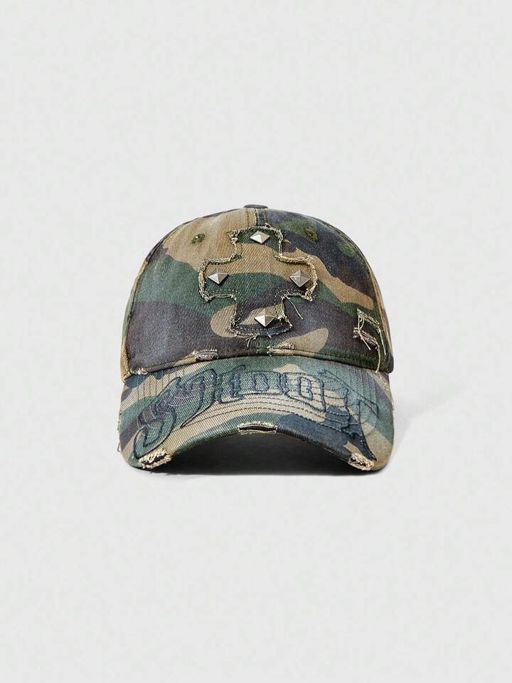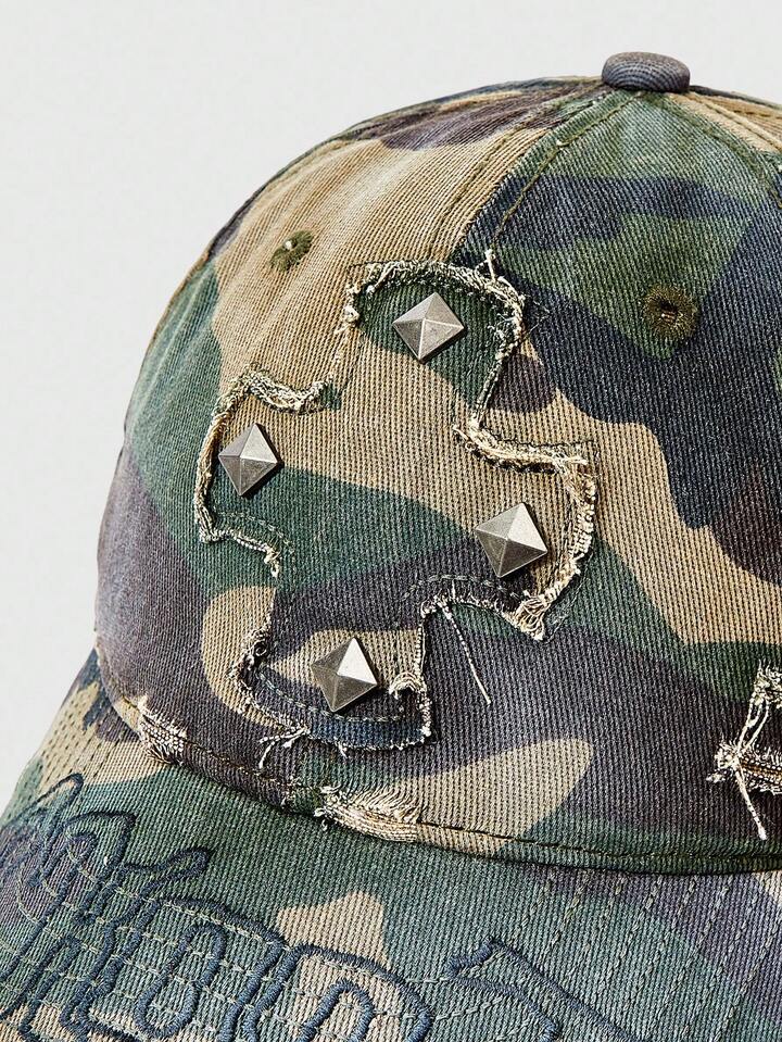 Grunge Punk Vintage berretto da baseball asimmetrico con stampa di rivetti a croce in camouflage invecchiato e distressed, cappello da sole vintage, accessorio moda versatile unisex con chiusura a scatto