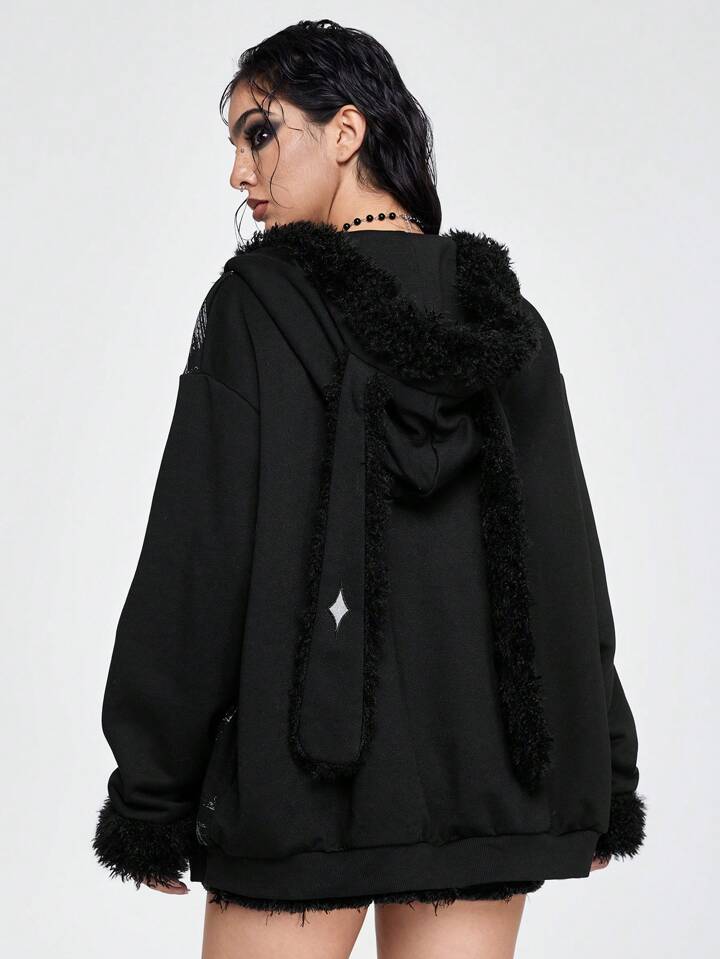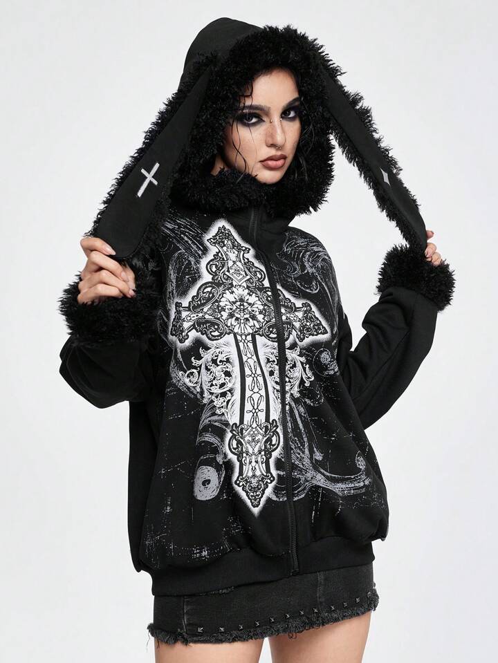 Grunge Punk Felpa con cappuccio morbida e larga con orecchie di coniglio e stampa a croce in stile vintage per donna