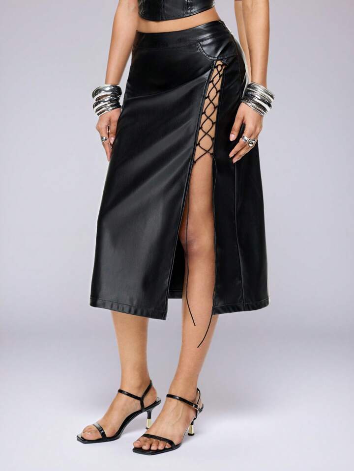 Grunge Punk Gonna vintage punk goth in pelle PU con spacchi laterali e lacci in vita, per donne, estiva